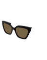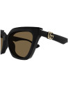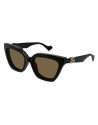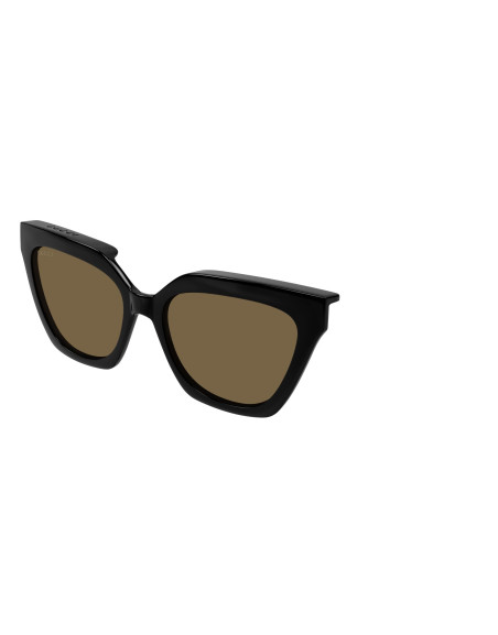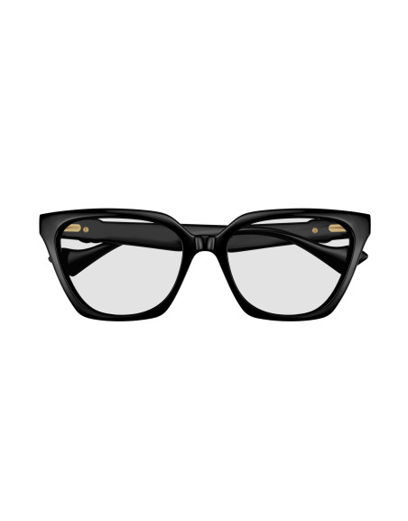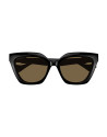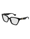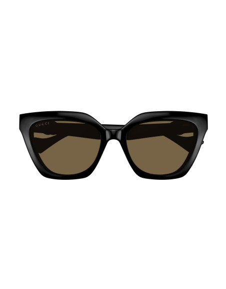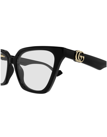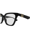 Occhiale da vista/sole dalla forma cat-eye in acetato lucido nero con logo Gucci inciso al laser sulla clip, visibile dall’alto. Semplicità e minimalismo caratterizzano le linee essenziali di questo modello, per un look cool e di tendenza.