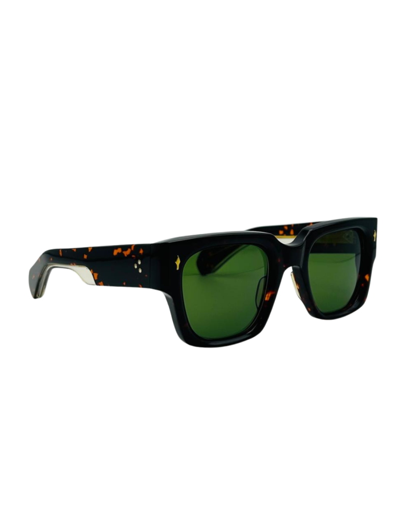 Occhiali da sole Jacques Marie Mage modello Enzo Etna: ispirati ai grandi protagonisti dell’automobilismo e alle forme iconiche delle auto che hanno definito il concetto di stile moderno. La montatura, scolpita in spesso acetato havana lucido, trasmette forza e presenza, mentre i dettagli in argento sterling – dalla punta di freccia incastonata sul frontale al filo interno inciso con precisione – raccontano una storia di artigianalità meticolosa. Le aste, realizzate con una raffinata laminazione doppia e arricchite da metalli preziosi, confermano l’approccio esclusivo del brand, mentre le lenti verdi offrono una visione nitida e protetta, grazie al trattamento antiriflesso sul lato interno e alla protezione UV totale.