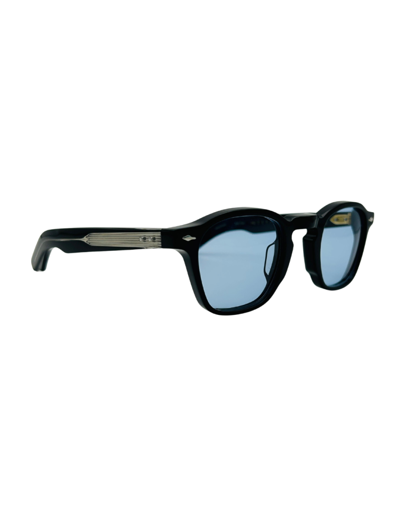 Occhiale da sole Jacques Marie Mage ZEPHIRIN 47 Obscure, un modello sofisticato e senza tempo, caratterizzato da silhouette quadrata con proporzioni regolari e linee scultoree. Realizzato in pregiato acetato di cellulosa spesso 10 mm con tempiali laminati su misura, perni frontali a forma di freccia e anima metallica a vista, unisce meticolosa artigianalità giapponese a dettagli preziosi e finiture curate. Il contrasto tra montatura nera e lenti azzurre dona un fascino discreto ma deciso, perfetto per l’esteta moderno che apprezza eleganza storica e modernità funzionale in un’edizione limitata.