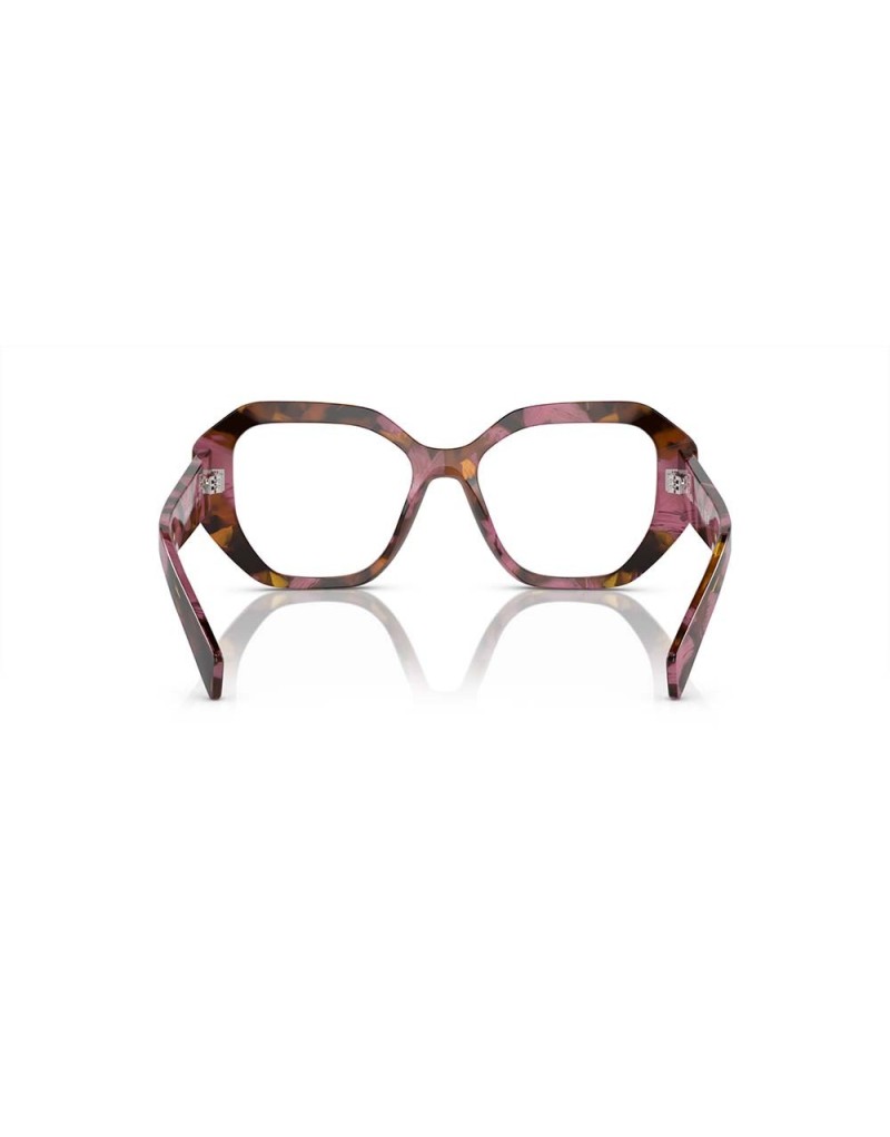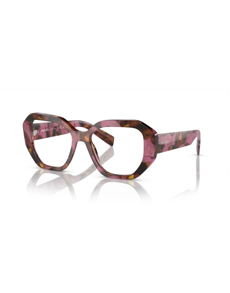 Occhiali da vista Prada da donna con montatura in acetato lucido effetto tartarugato con sfumature rosa. Design scultoreo e sfaccettato dalla forma irregolare con firma Prada sulle aste. Adatto per ogni fisionomia, un accessorio che arricchisce i tuoi look rendendoli unici ed eleganti.