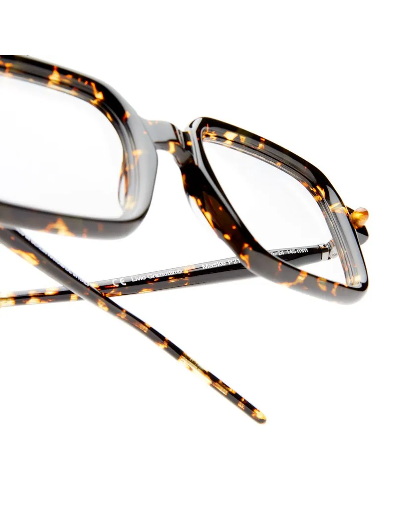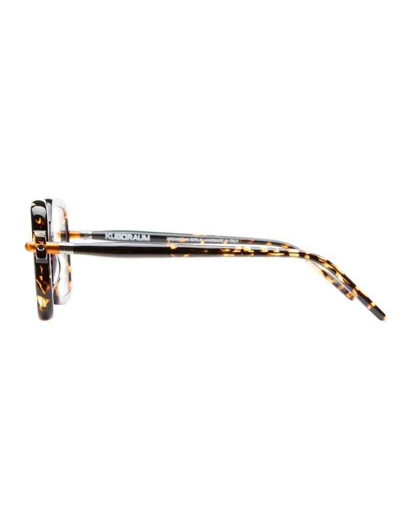 Occhiali da vista Kuboraum dalla linea minimal quadrata e arricchiti dalle aste tubolari, segno indistinguibile di Kuboraum. Un modello dal fascino unico, realizzato in Italia in pregiato acetato di cellulosa lucido.
