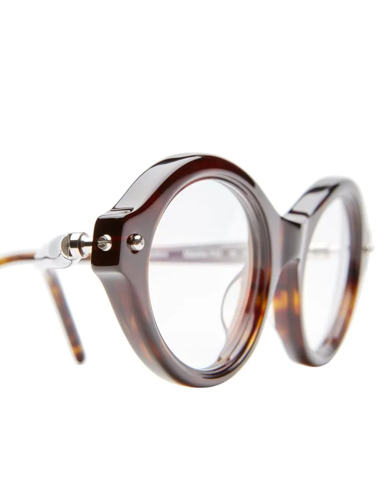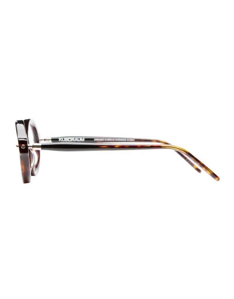 Montatura per occhiali da vista Kuboraum in pregiato acetato italiano Mazzucchelli, dal design unico nel suo genere e aste tubolari, per un look fuori dagli schemi e uno sguardo davvero in primo piano.