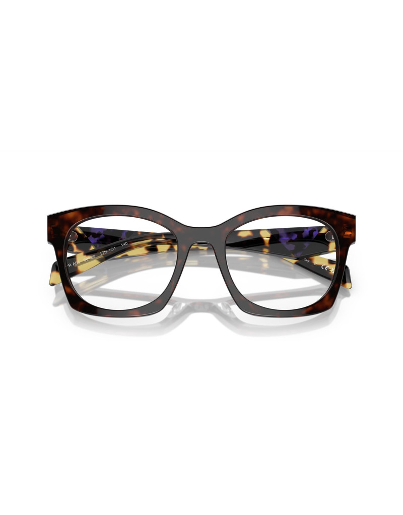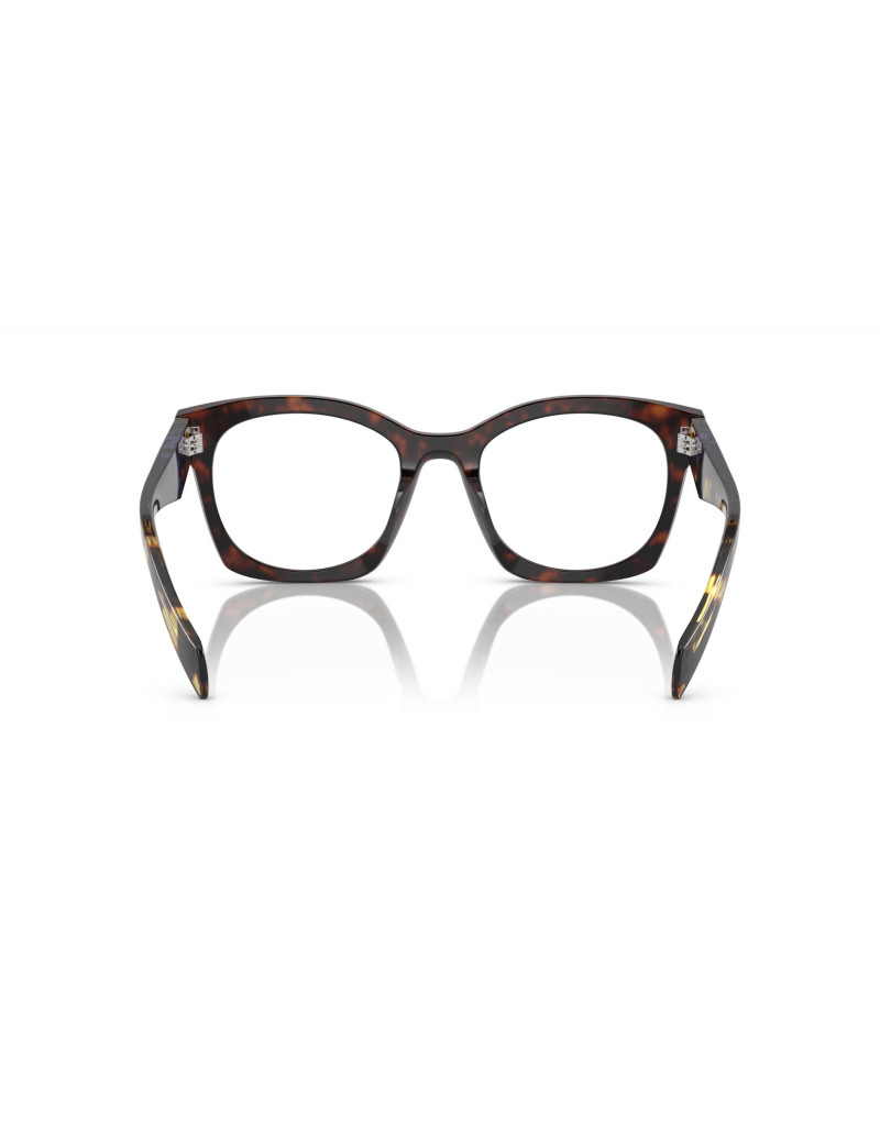 Montatura per occhiali da vista Prada in elegante acetato lucido havana, con aste chiare a fantasia. Il ciliare ondulato mette in primo piano lo sguardo di chi li indossa.