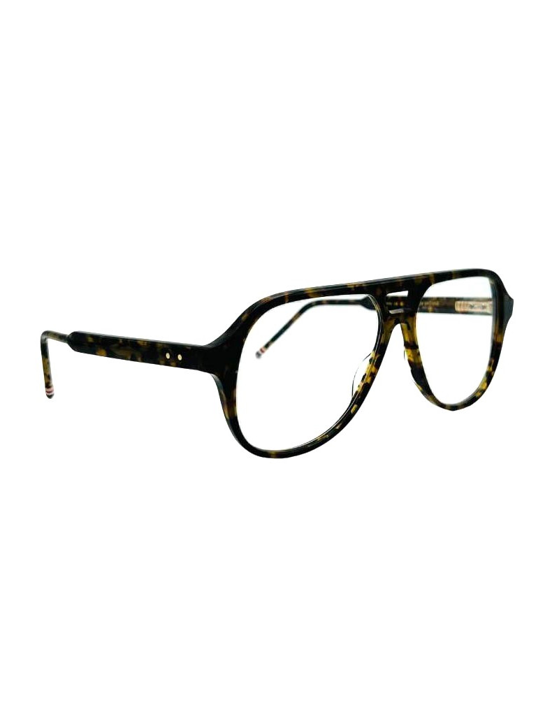 Occhiale da vista di Thom Browne in acetato color havana dal design pilot, con il doppio ponte. Caratterizzato da aste spesse che si assottigliano sul terminale, dettaglio distintivo del brand.