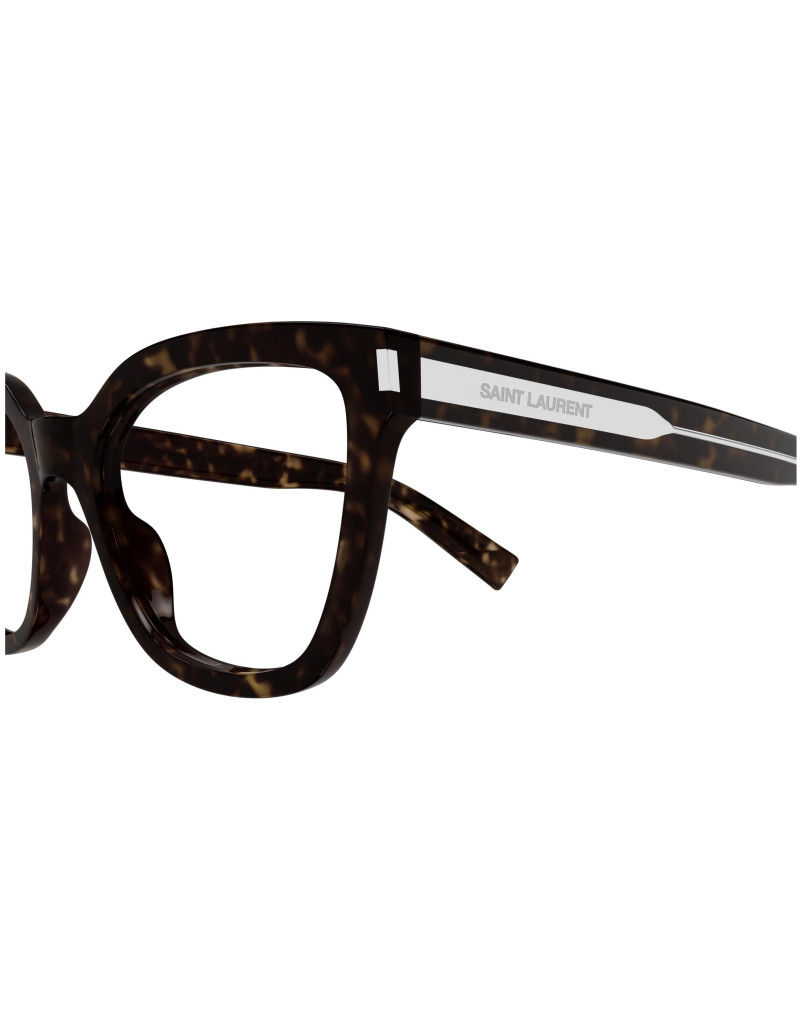 Gli occhiali da vista Saint Laurent SL 748 002 presentano una montatura in acetato color havana scuro lucido. Le aste aggiungono un tocco di eleganza discreta. La forma a farfalla e il design oversize conferiscono un aspetto sofisticato e moderno.