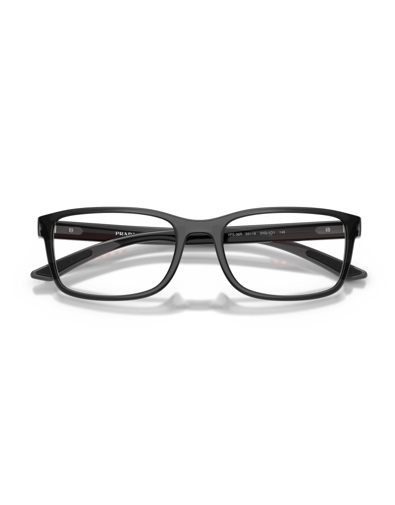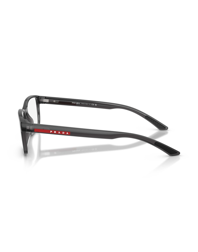 Gli occhiali da vista Prada Linea Rossa 06RV 01D1O1 presentano una montatura rettangolare in acetato trasparente grigio, con aste in nylon e dettagli in metallo. Adatti ad ogni tipologia di viso maschile.