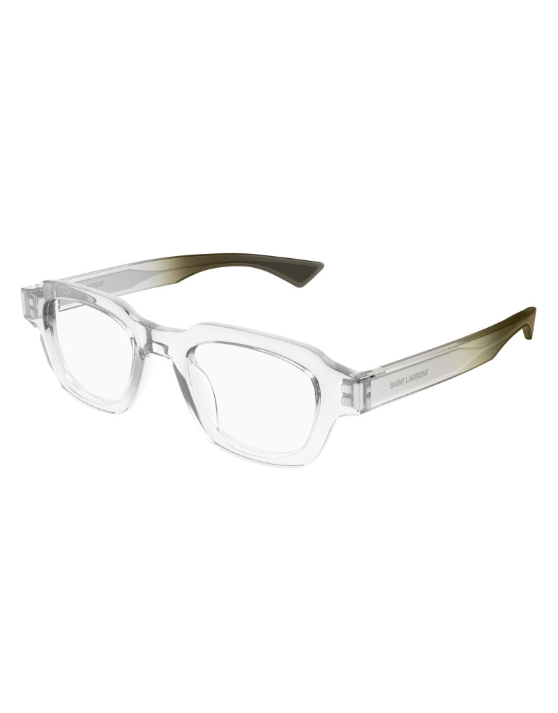 Occhiali da vista Saint Laurent da uomo, un modello in acetato con montatura trasparente che sfuma in un tono di verde sulla parte finale delle aste, che conferisce un look sofisticato. La forma squadrata della montatura è perfetta per aggiungere un tocco di glamour in più. Un accessorio intramontabile che unisce stile e funzionalità in ogni occasione.