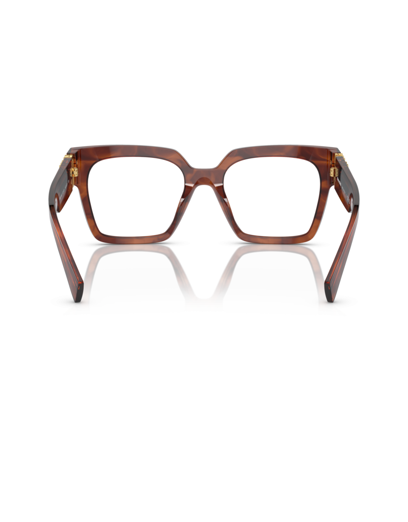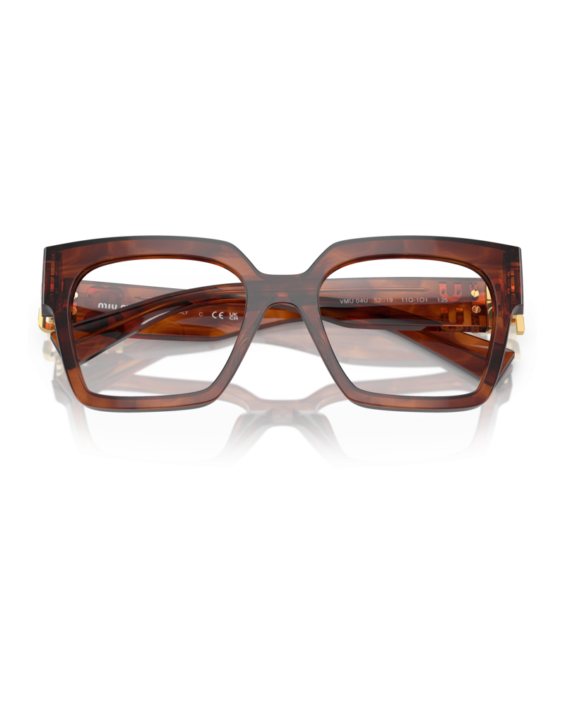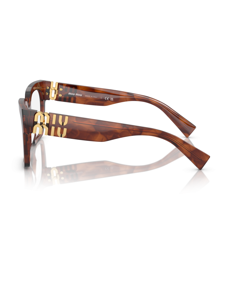 Occhiali da vista Miu Miu 04UV 11Q1O1 52 per donna che presentano una forma elegante e moderna, con una montatura in color havana. Il design raffinato e la finitura con logo dorato sulle aste donano un tocco di lusso discreto, mentre la silhouette leggermente irregolare aggiunge un accento femminile e alla moda. Questi occhiali sono perfetti per chi cerca un accessorio di tendenza con un tocco di classe.