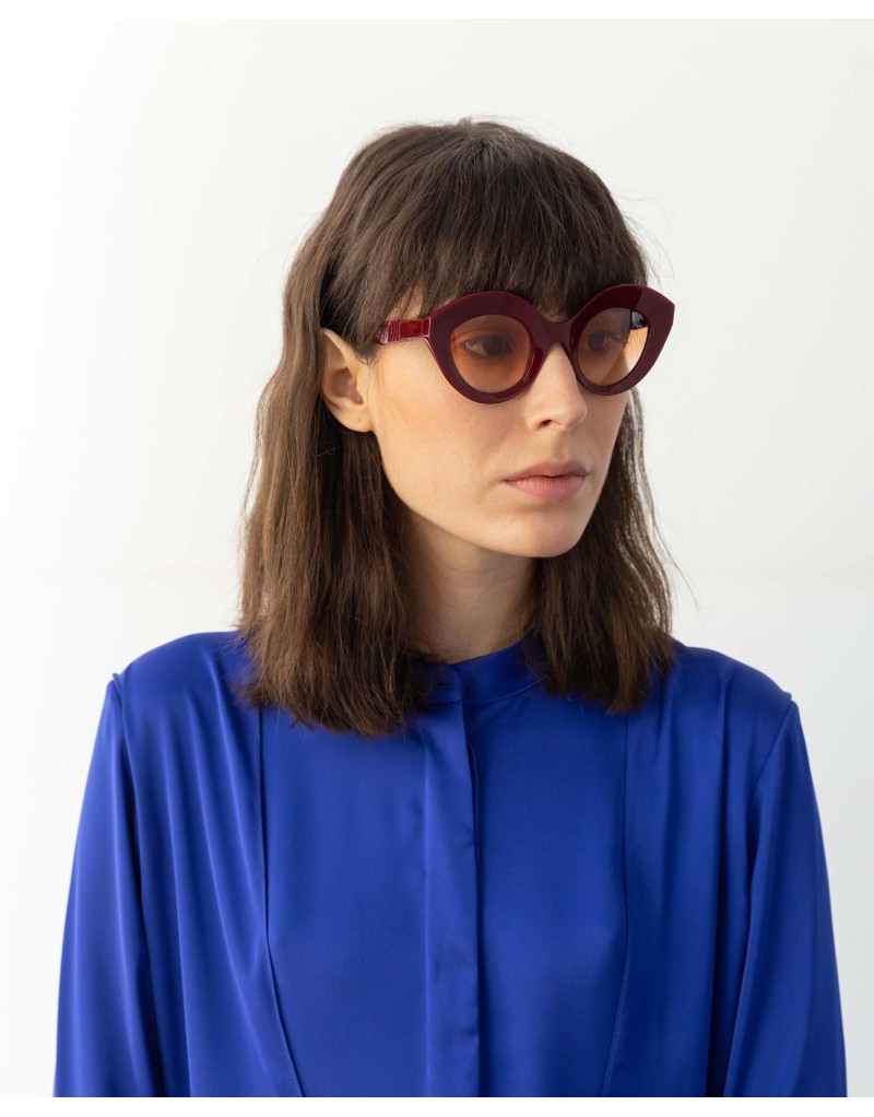 Occhiali da sole realizzati a mano in Brasile in pregiato acetato di cellulosa. Questo modello è caratterizzato dalla colazione brillante, la forma cat-eye arrotondata e l’intrigante gioco di spessori.