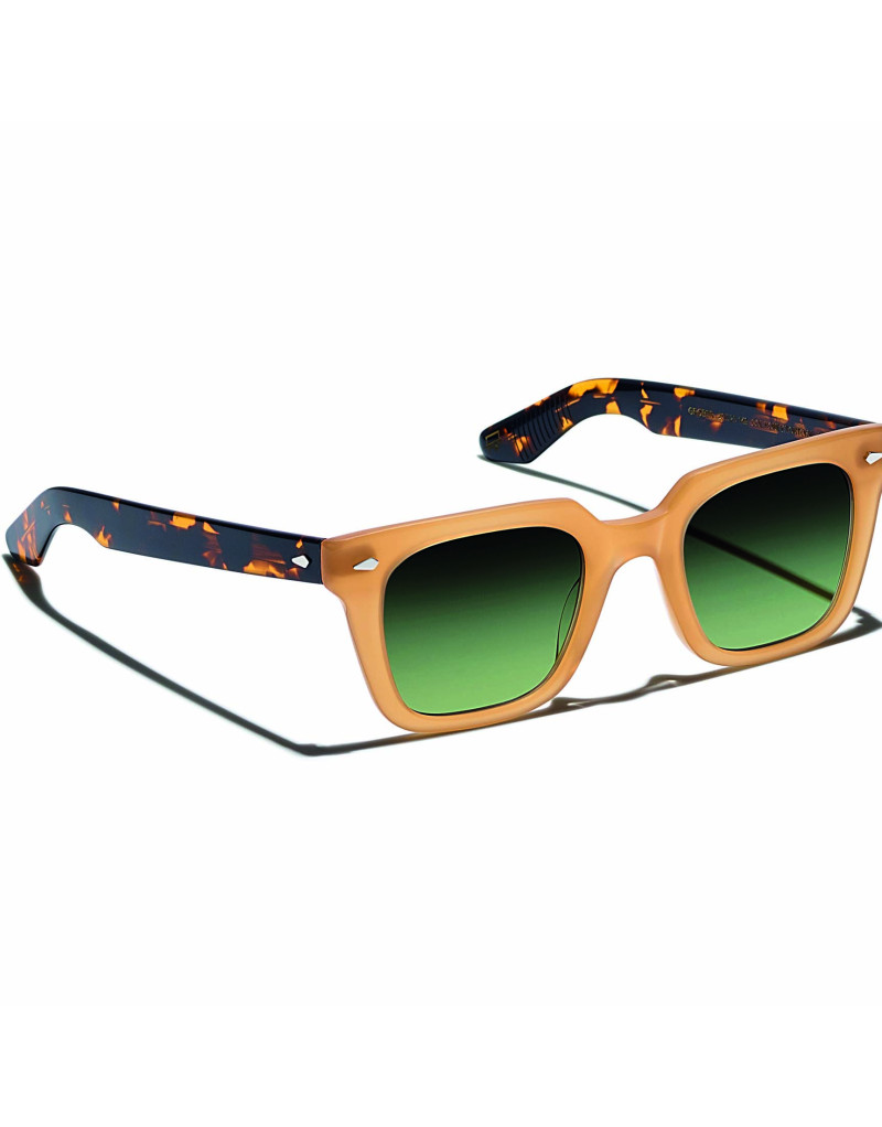 Grober, il giovane di casa Moscot dal fascino vintage. Occhiali squadrati in acetato di cellulosa miele, aste tortoise e lenti verdi.