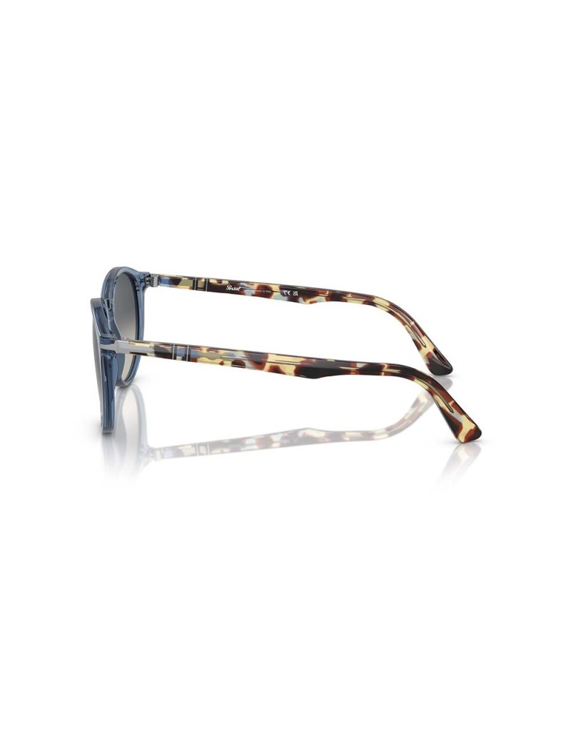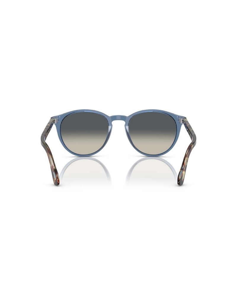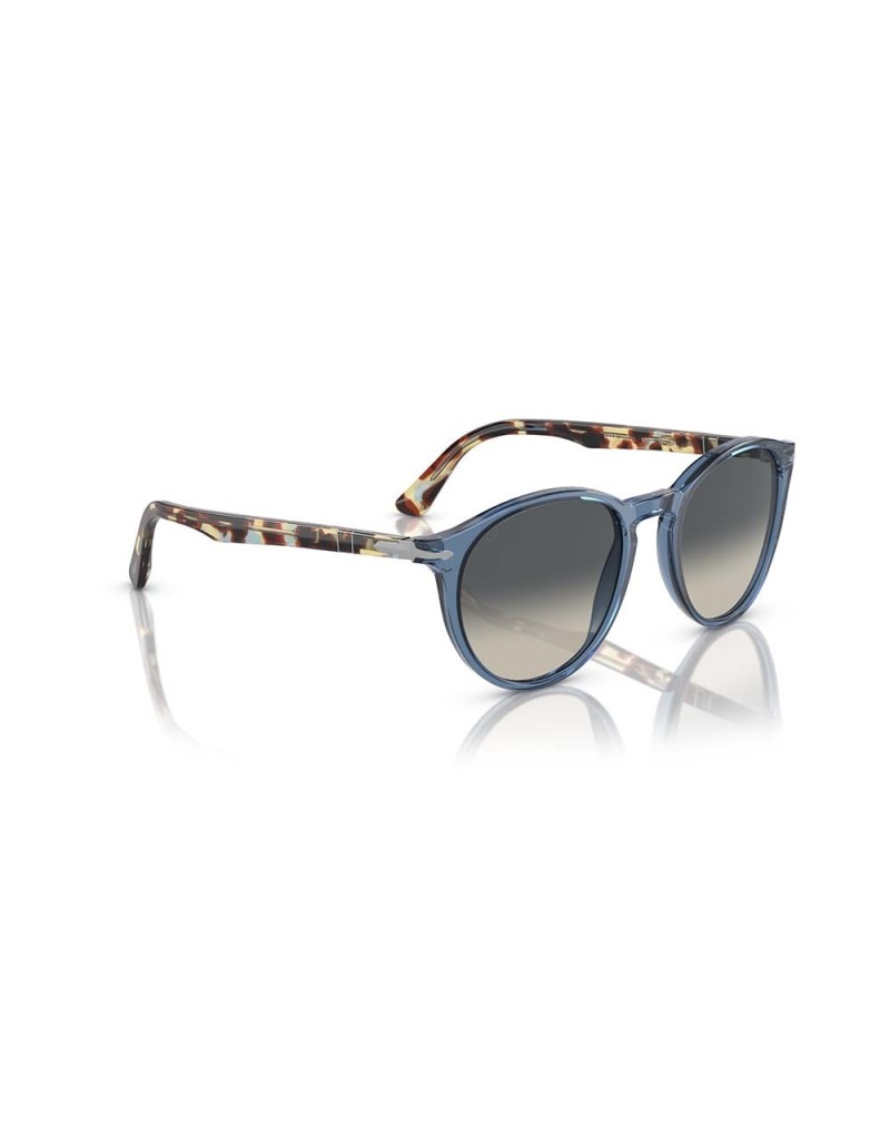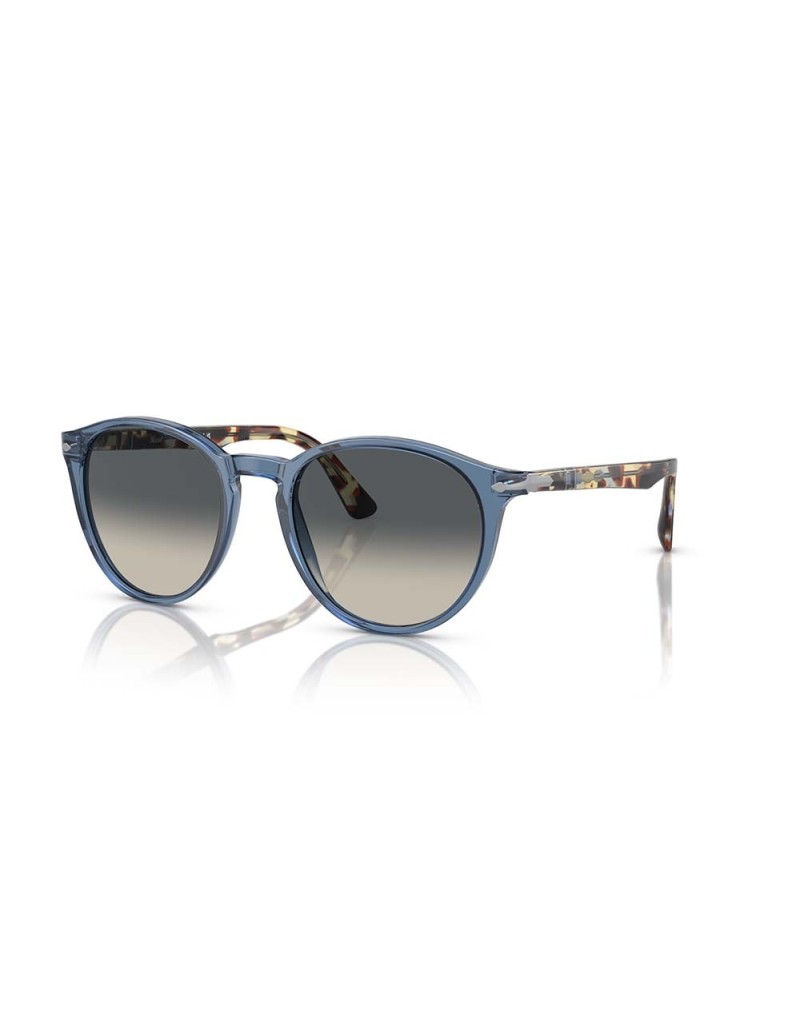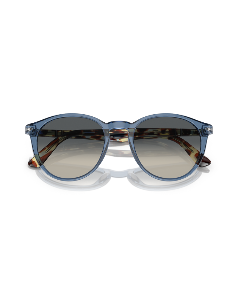 Occhiali da sole Persol con montatura in acetato lucido blu navy effetto trasparente, caratterizzato da linee rotondeggianti. La lente color grigio chiaro sfumato in cristallo assicura una tenuta del colore attraverso gli anni e una minore tendenza a graffiarsi. Un accessorio dallo stile casual e ultraleggero.