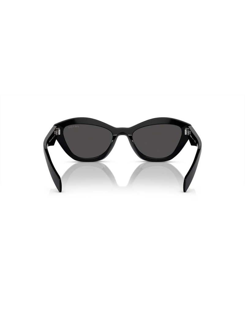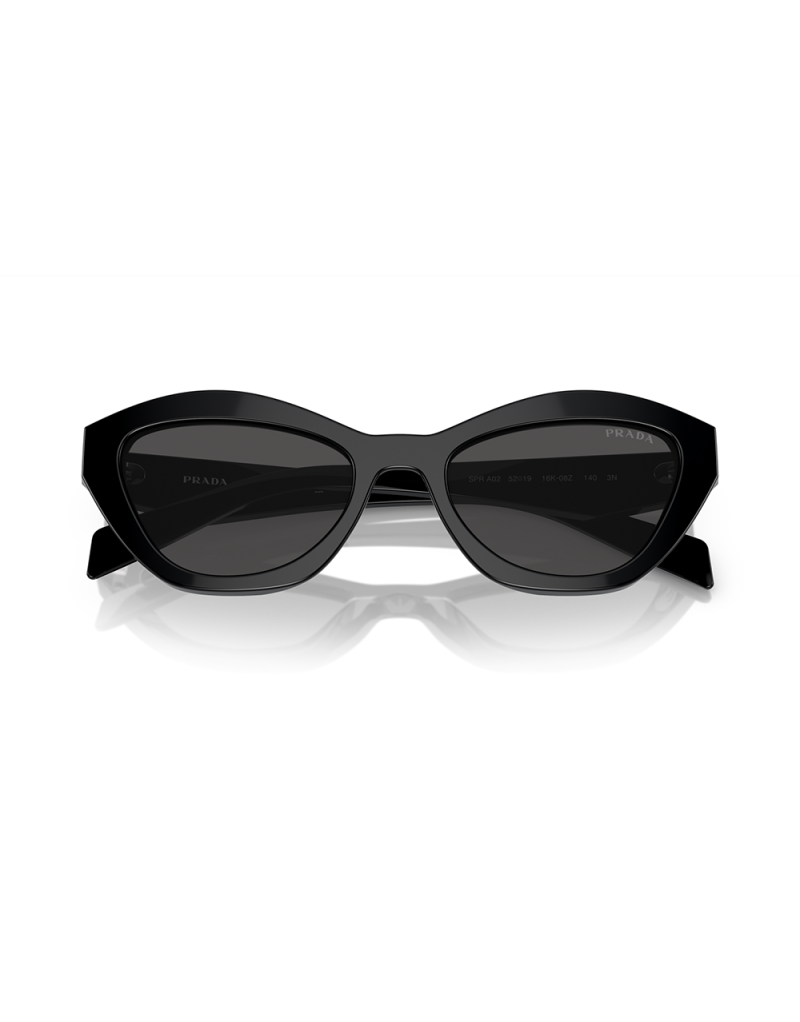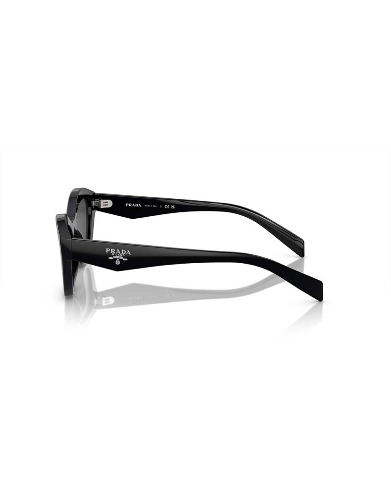 Occhiali da sole Prada da donna in acetato nero lucido con lenti grigio scuro. Un modello dal design sfaccettato ed elegante forma cat-eye. Le aste sono arricchite dall’iconico logo Prada a triangolo. Un accessorio che si adatta ad ogni forma di volto, per uno stile glamour e senza tempo.