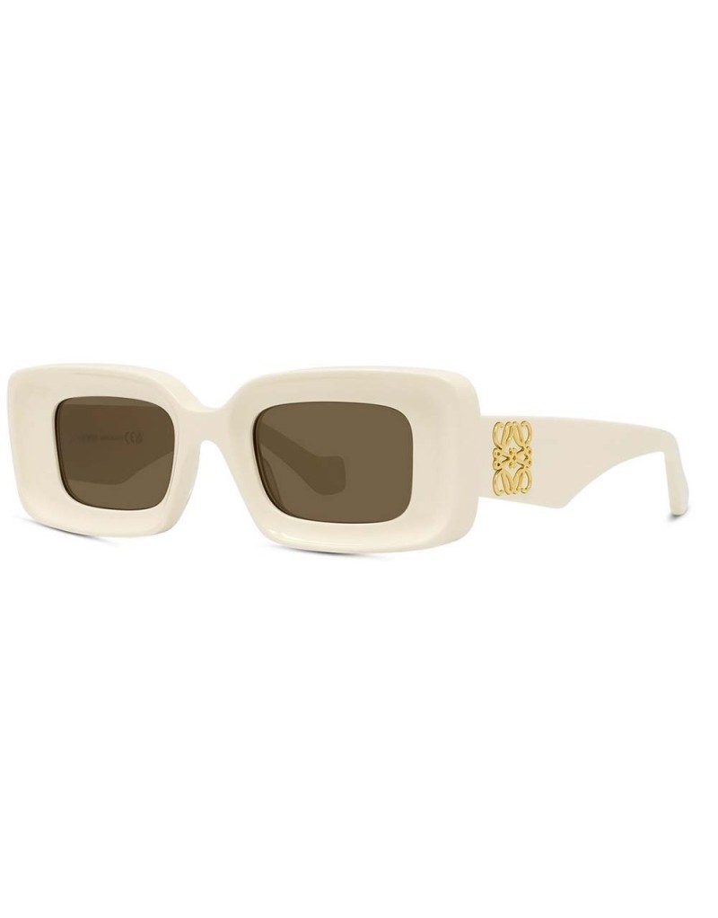 Occhiali da sole Loewe da donna in acetato avorio lucido con lenti marroni. Un occhiale dal fascino retrò in forma rettangolare caratterizzato da giochi di spessore. Un accessorio elegante e di gran classe con logo della casa di moda color oro sulle aste.