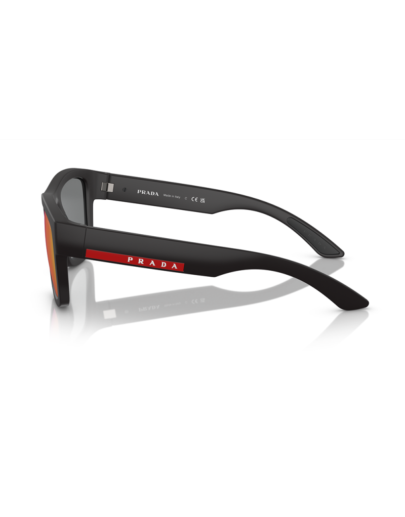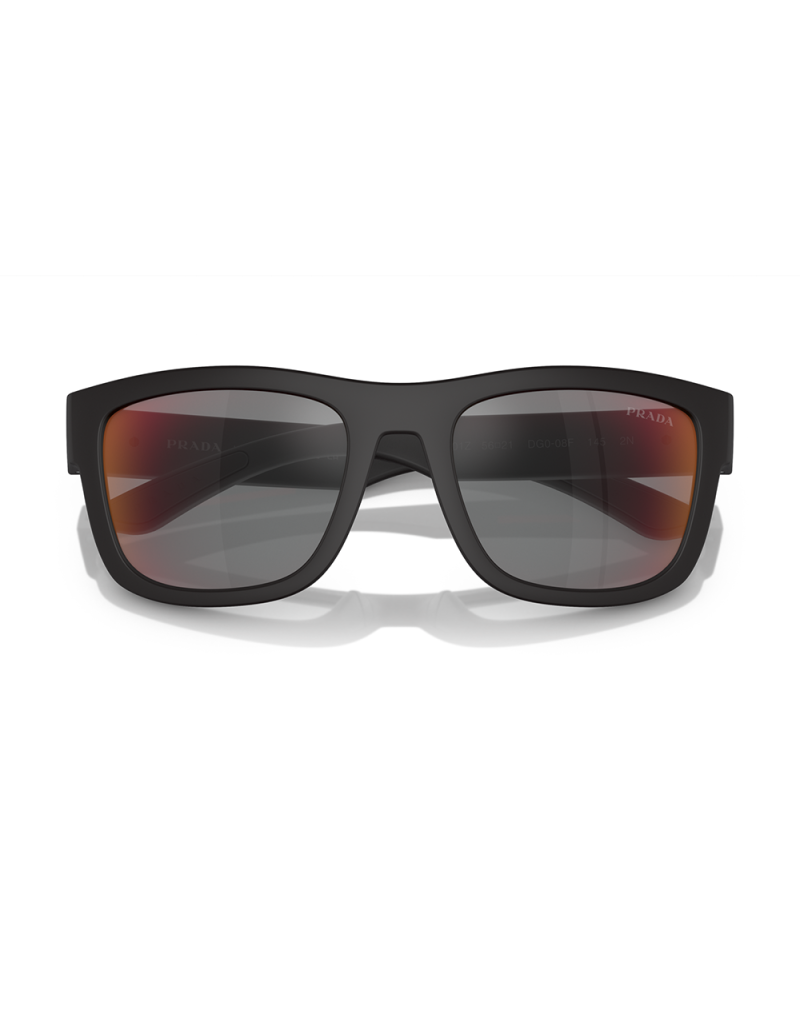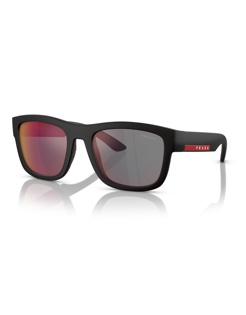 Occhiali da Sole Prada Linea Rossa ultraleggeri con montatura in gomma aderente al volto e lente specchiata rossa, per il massimo del comfort visivo e di calzata.