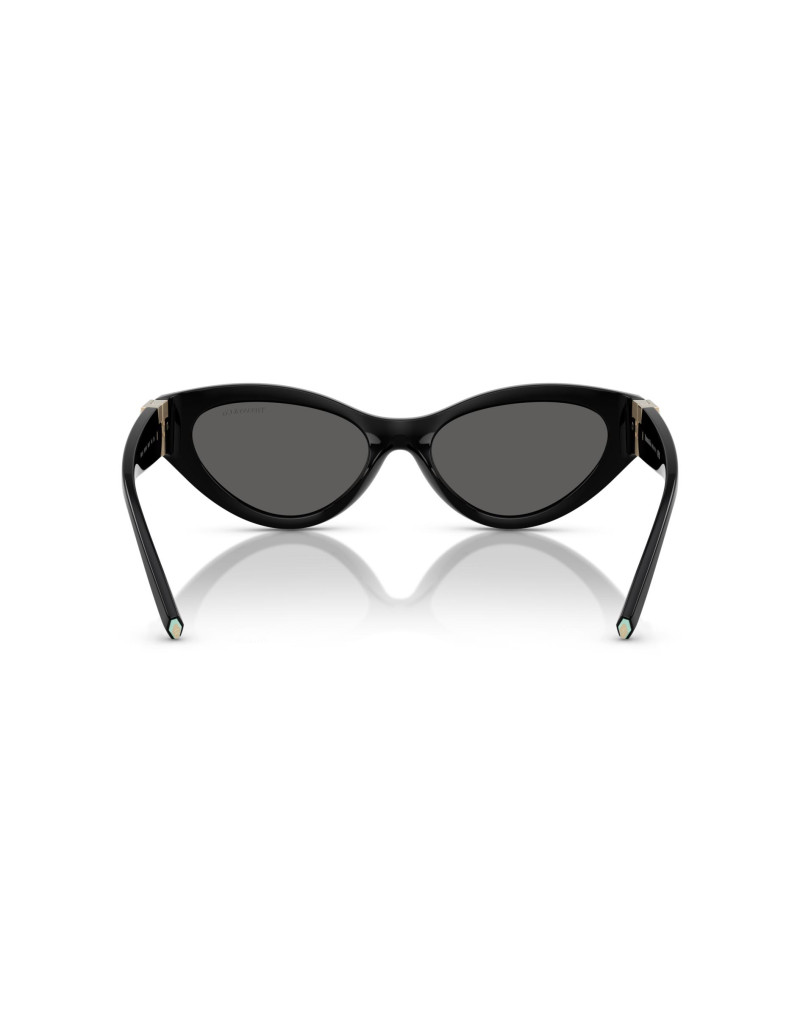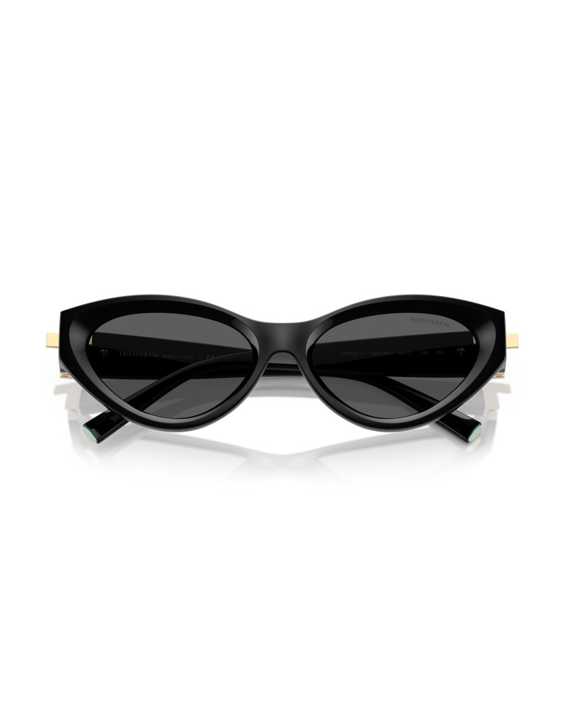Occhiali da sole Tiffany & Co. dal design cat-eye stretto e look contemporaneo total black. Aste spesse con motivo a T sfaccettato.