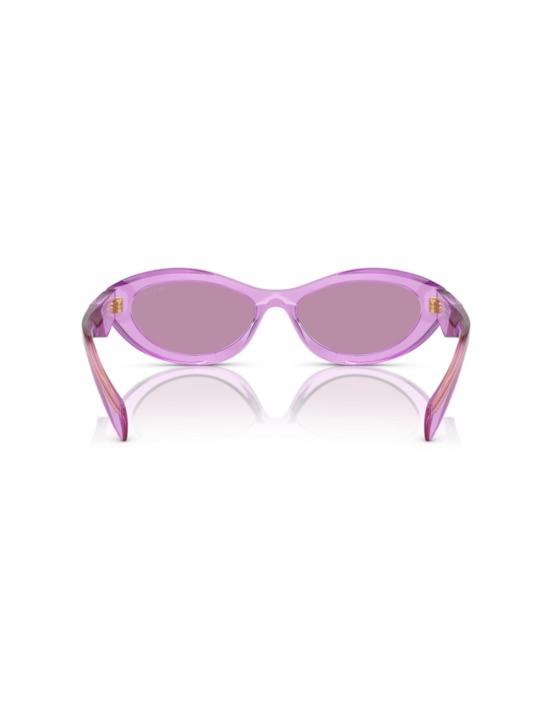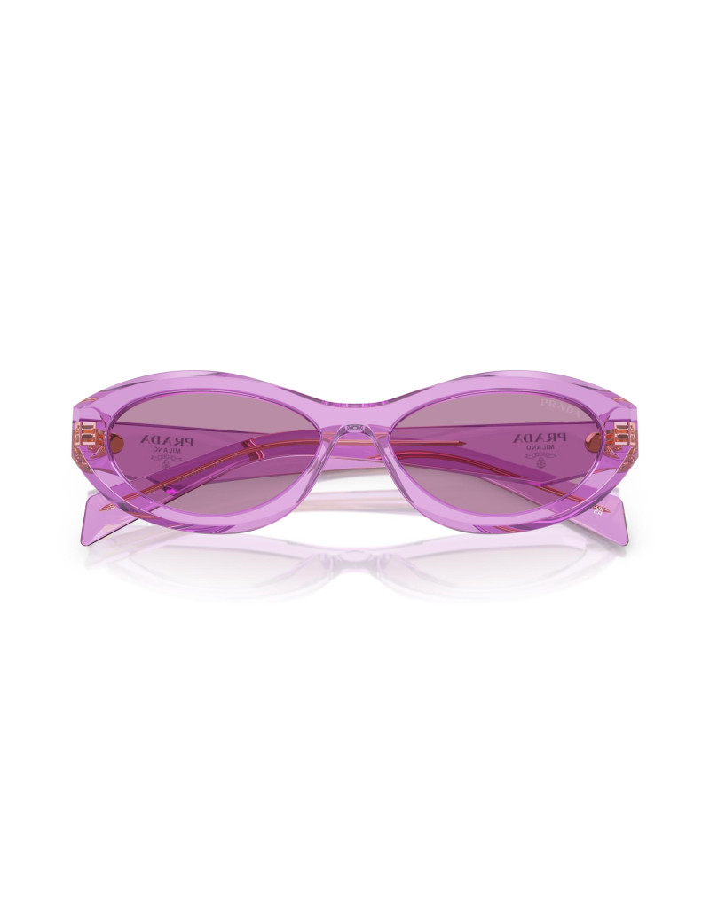 Occhiali da sole Prada da donna con montatura in acetato lucido color ametista trasparente e lenti viola. Un modello che si distingue per il suo particolare design sfaccettato delle aste, ispirato all'iconico triangolo e arricchito dal logo Prada.