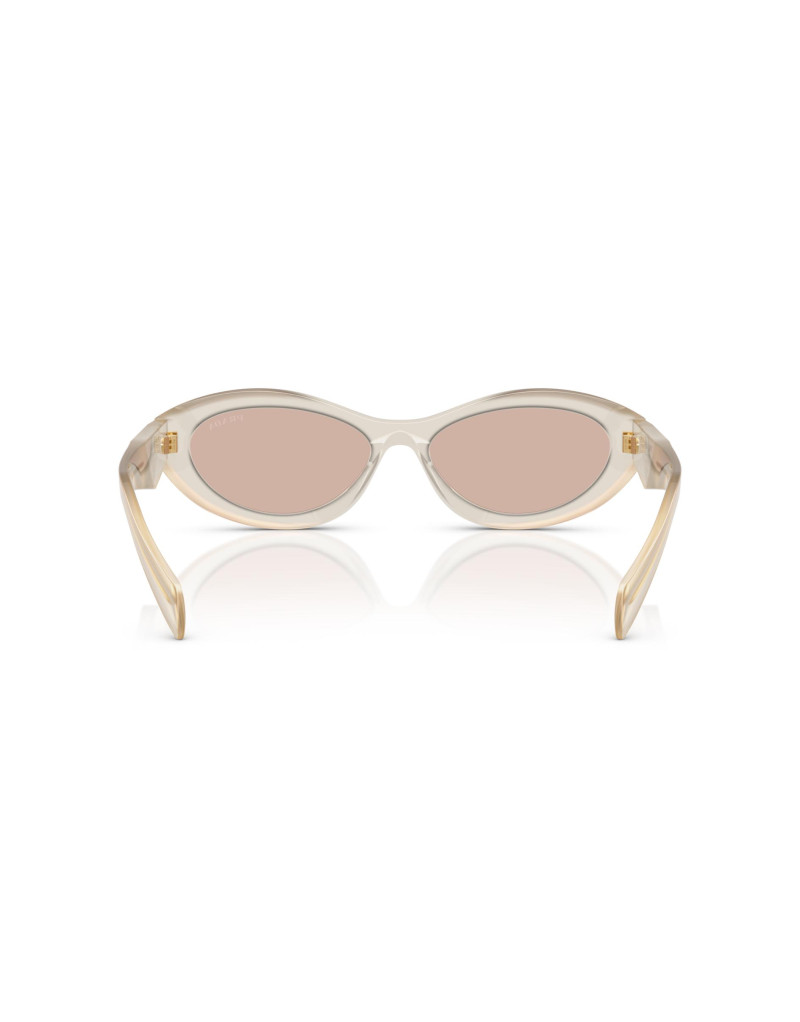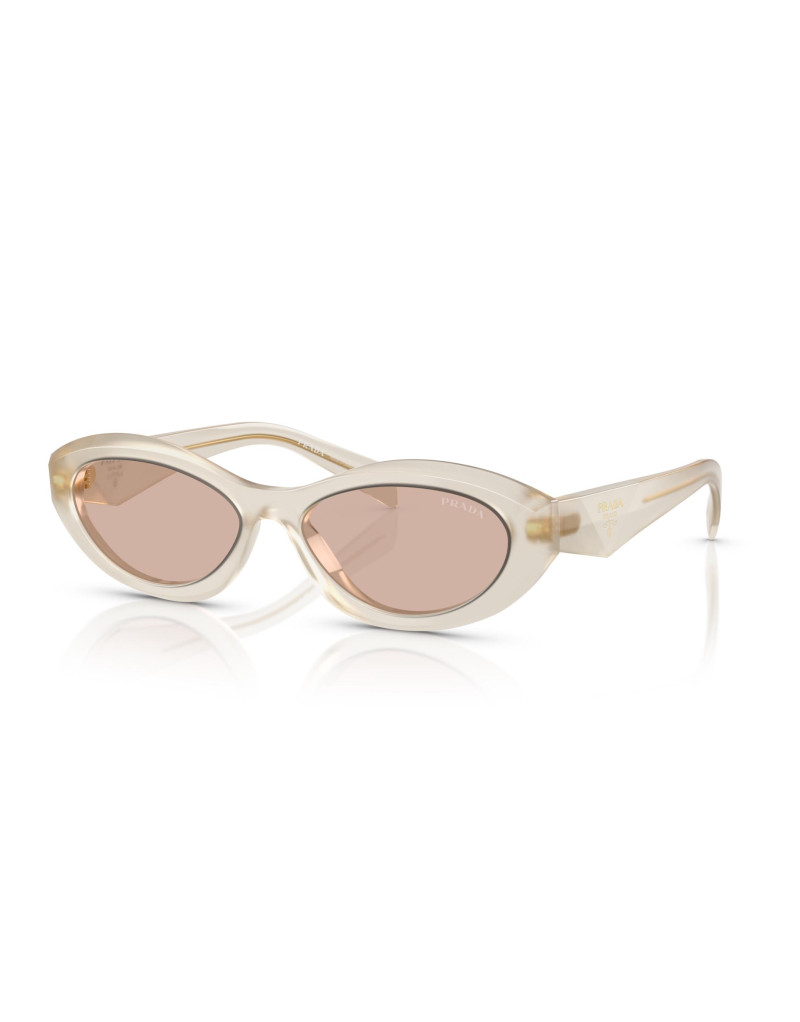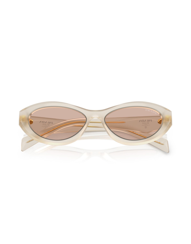 Occhiali da sole Prada da donna con montatura in acetato latte opalino lucido e lenti marrone chiaro. Un occhiale che si distingue per il suo particolare design sfaccettato delle aste, ispirato all'iconico triangolo e arricchito dal logo Prada.