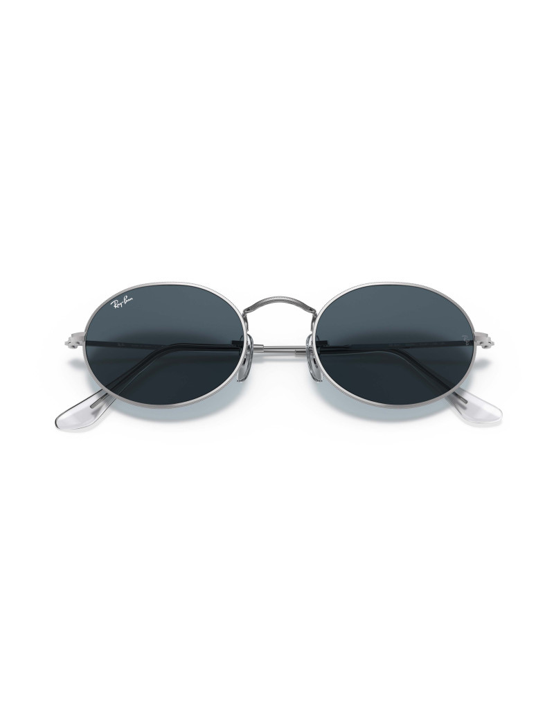 Occhiali da sole Ray‑Ban modello Oval RB 3547 003/R5 calibro 51, con montatura in metallo argento lucido e lenti blu dalle tonalità intense. Un accessorio sofisticato e minimalista che unisce stile e protezione visiva.