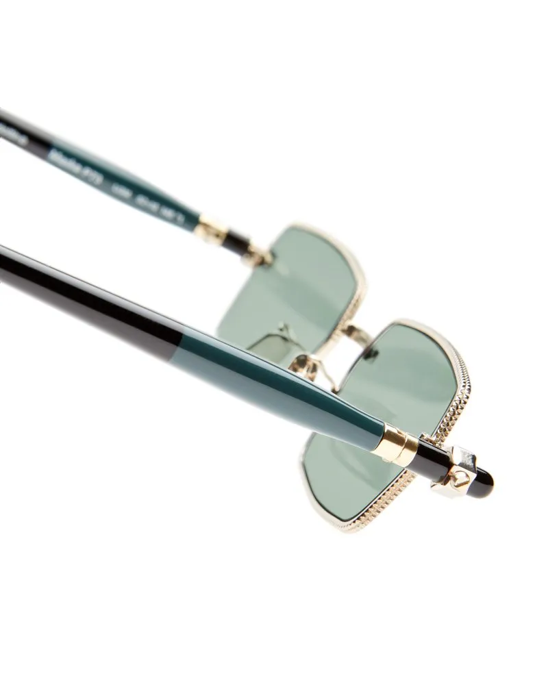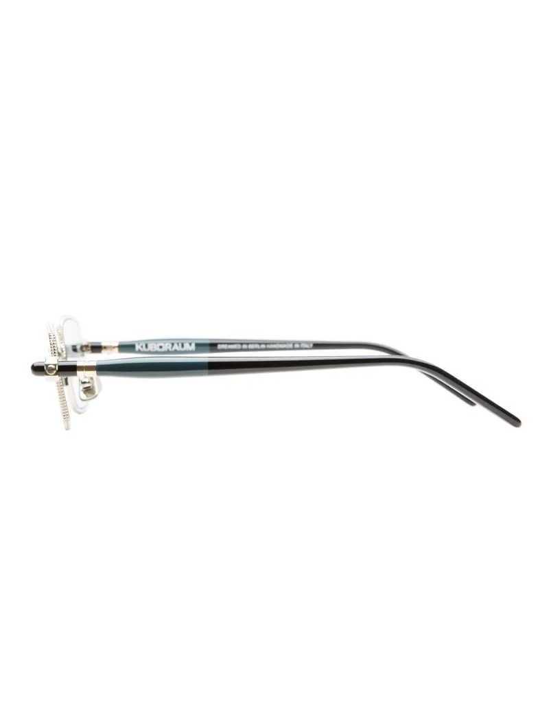 Occhiali da Sole Kuboraum con frontale in metallo e aste tubolari in acetato, con lenti chiare che lasciano trasparire lo sguardo. Questo modello è stato realizzato interamente a mano in Italia.
