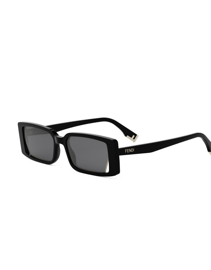 Occhiali da donna Fendi, con taglio diagonale sulla lente e montatura in acetato smaltato che richiama il logo. Questo modello da sole ha una forma rettangolare skinny, più sottile e in linea con le tendenze moda attuali.