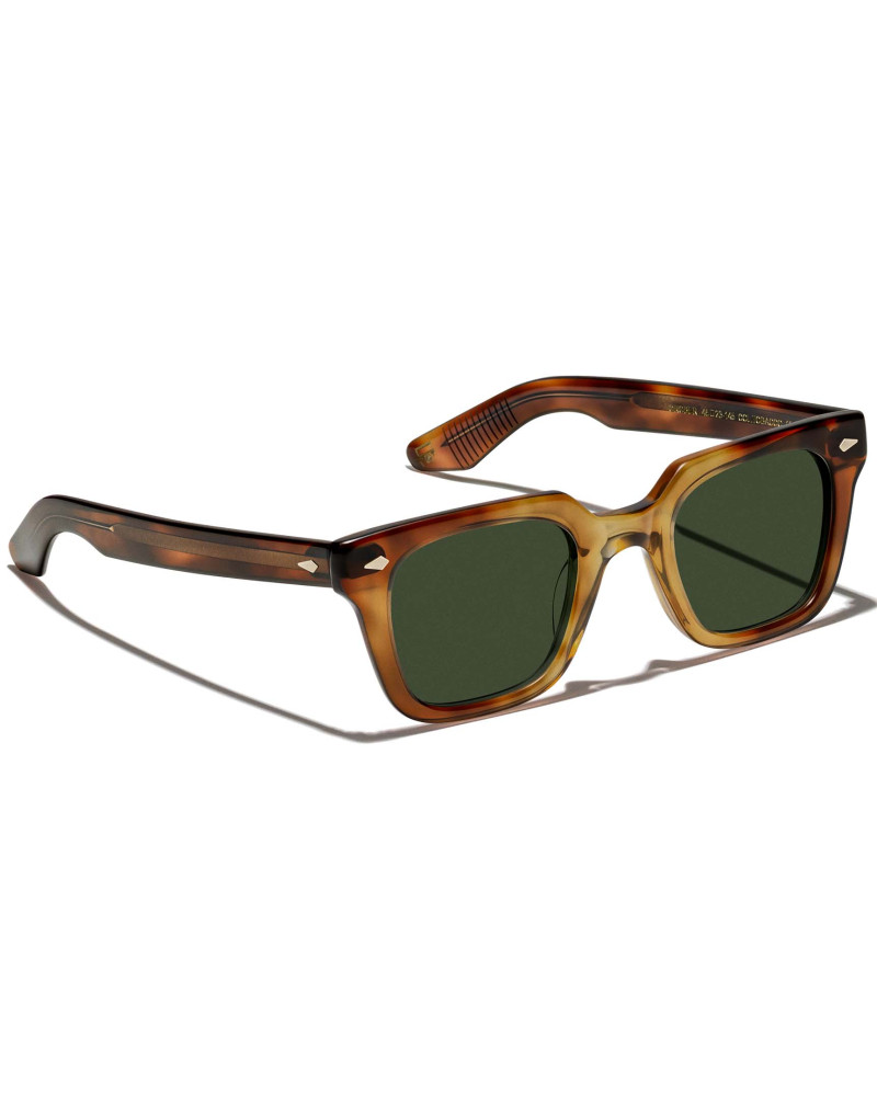 Grober, il giovane di casa Moscot dal fascino vintage. Occhiali squadrati in acetato di cellulosa color tabacco e lenti verdi.