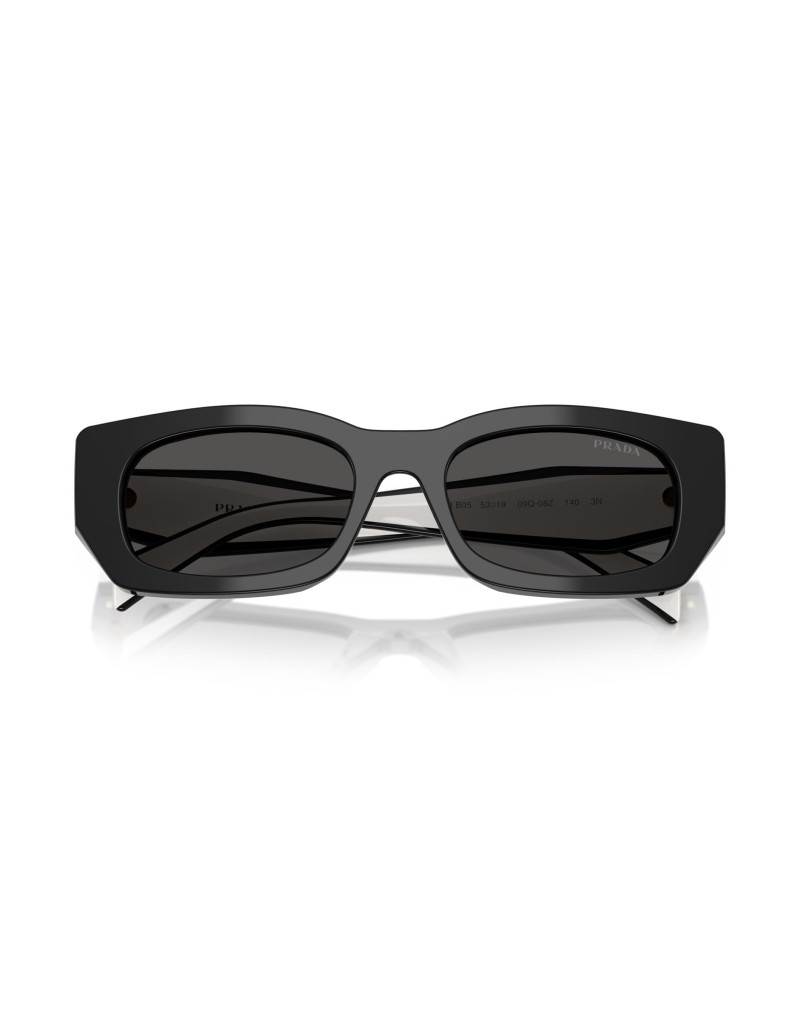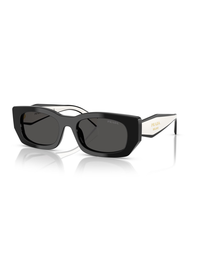 Occhiali da sole Prada da donna con montatura in acetato nero lucido e lenti nere. Un design geometrico dalle linee semplici e dalla forma rettangolare con la classica firma Prada sulle aste bianche e nere. Un modello che conferisce uno stile unico ad ogni look.
