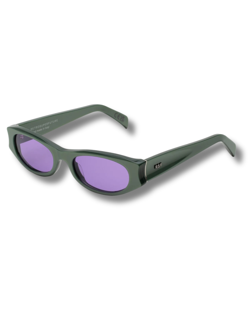 Occhiali da sole Retrosuperfuture Razzo metallic mint violet, un design dal fascino unico che richiama alla moda anni ’60 in questo modello RSF in acetato verde menta lucido lente lilla con elegante logo rifinito in oro sull'asta. Un modello in forma rettangolare dalle linee sinuose che conferisce stile e raffinatezza ai tuoi look.