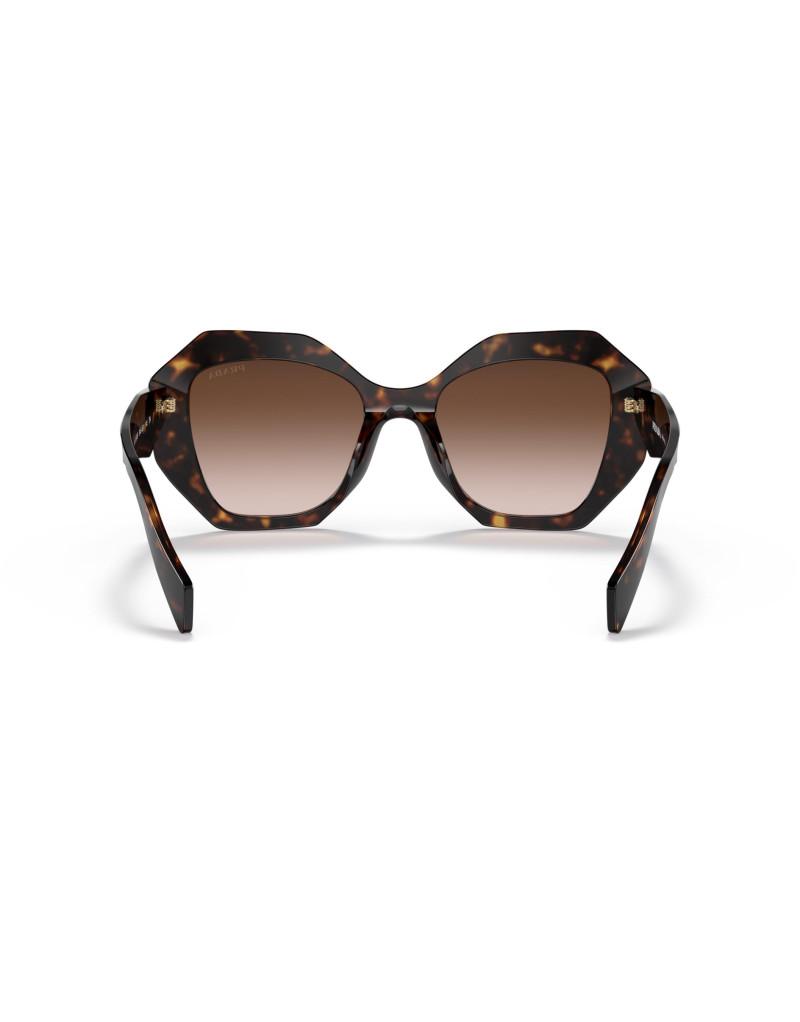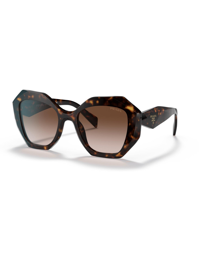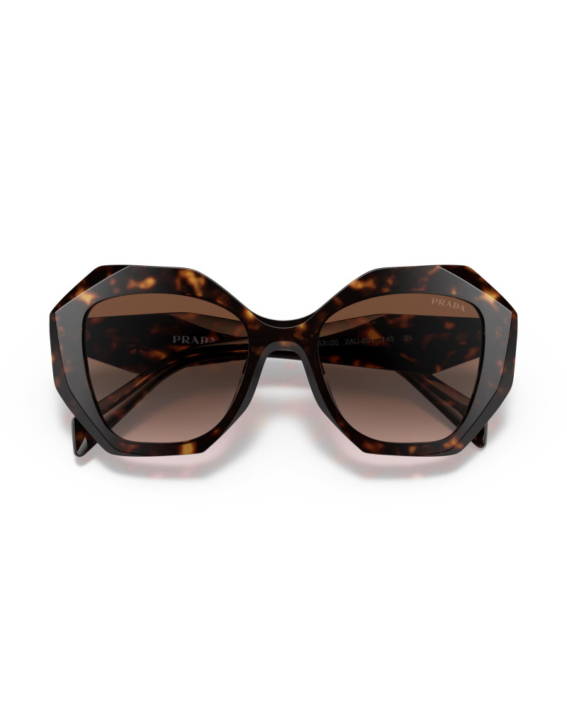Occhiali da sole Prada da donna in acetato havana lucido. Dal design ultra sfaccettato e ampio, con aste geometriche caratterizzate dal tradizionale triangolo con logo Prada. Un accessorio esclusivo per uno stile audace e contemporaneo.