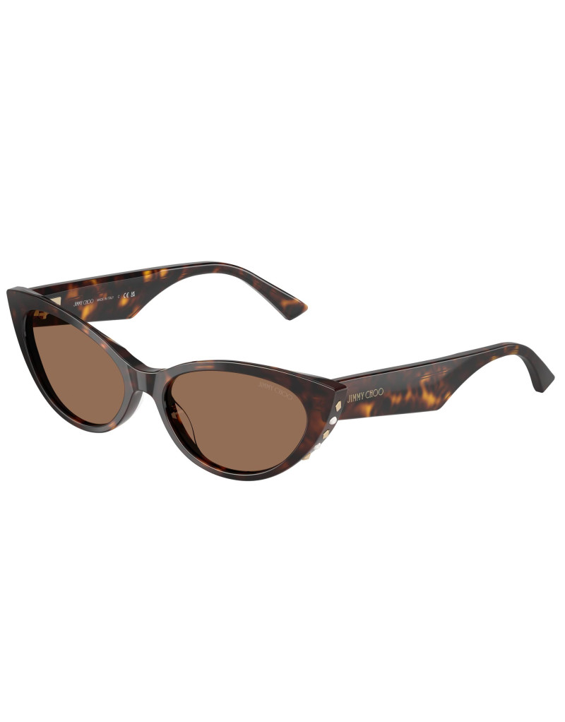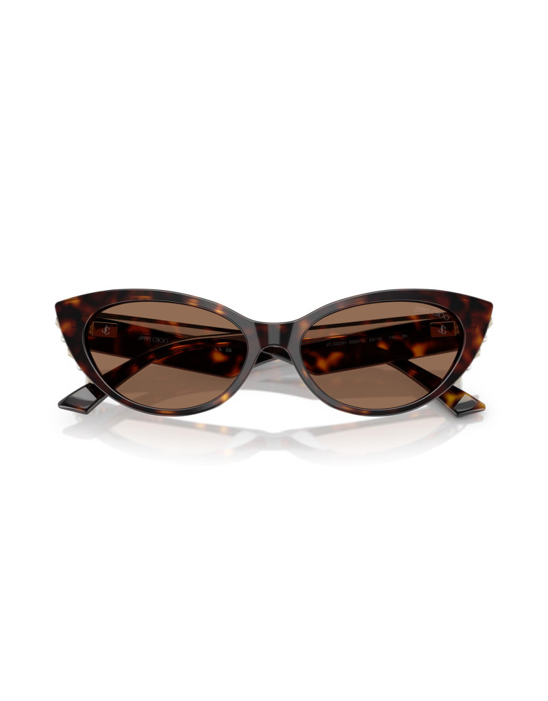 Occhiali da sole Jimmy Choo, simbolo di eleganza raffinata, questo modello dalla forma cat-eye con dettagli che mostrano l’inconfondibile glamour di Jimmy Choo. La parte inferiore delle aste, impreziosita da borchie in metallo e perle bianche, dona un tocco di lusso alla montatura. Il logo Jimmy Choo stampato a caldo in oro chiaro o argento completa le aste audaci, mentre il monogramma JC inciso a laser sulla cerniera personalizzata aggiunge un ulteriore dettaglio distintivo. Un occhiale perfetto per chi cerca eleganza e un design senza tempo.