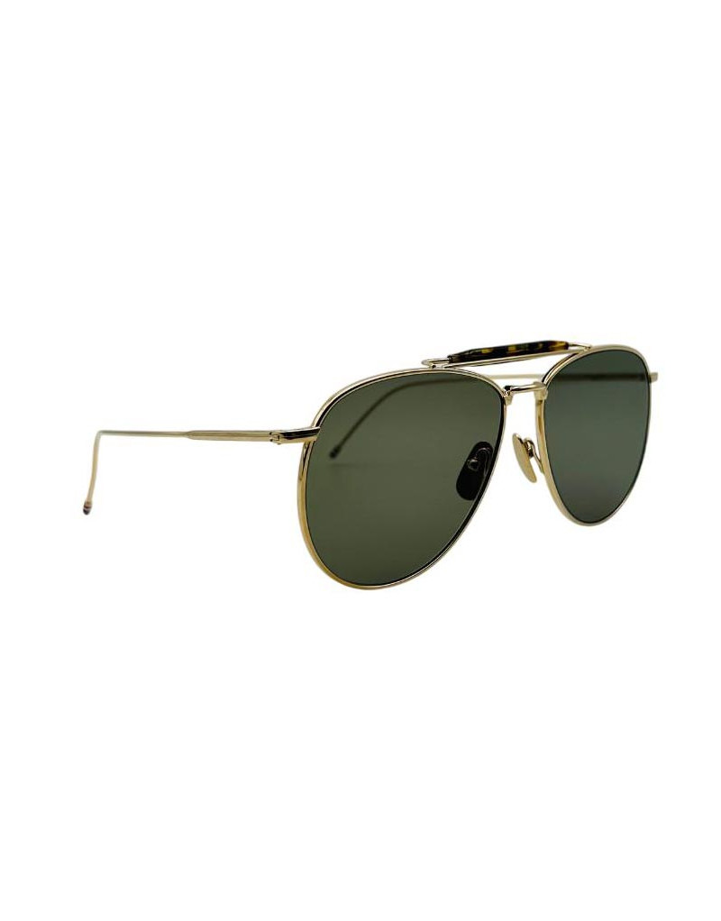 Occhiali da solr Thom Browne UES015A 711 con doppio ponte caratterizzati da una sofisticata montatura vintage in titanio color oro con il parasudore in acetato havana. Il modello pilot unisex è pensato per chi vuole esprimere sicurezza attraverso ogni dettaglio del proprio look, ed è l’accessorio ideale per chi ama distinguersi con stile.