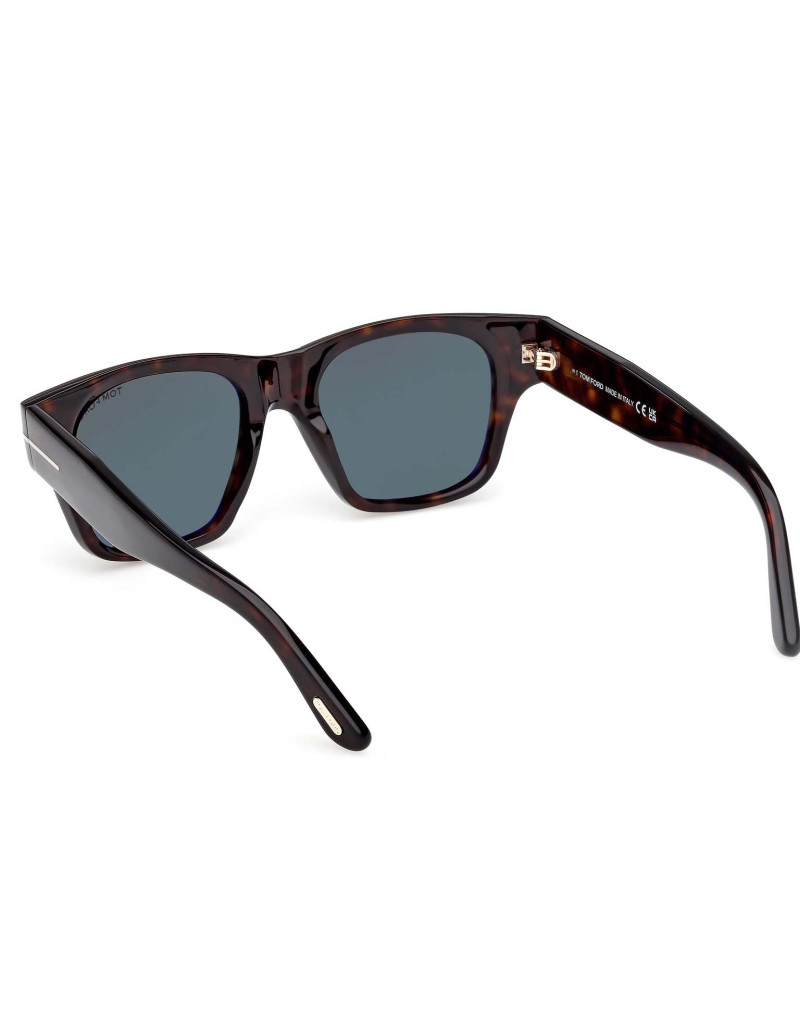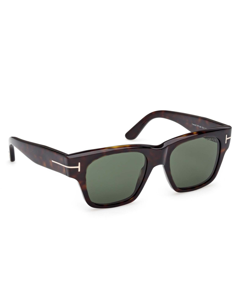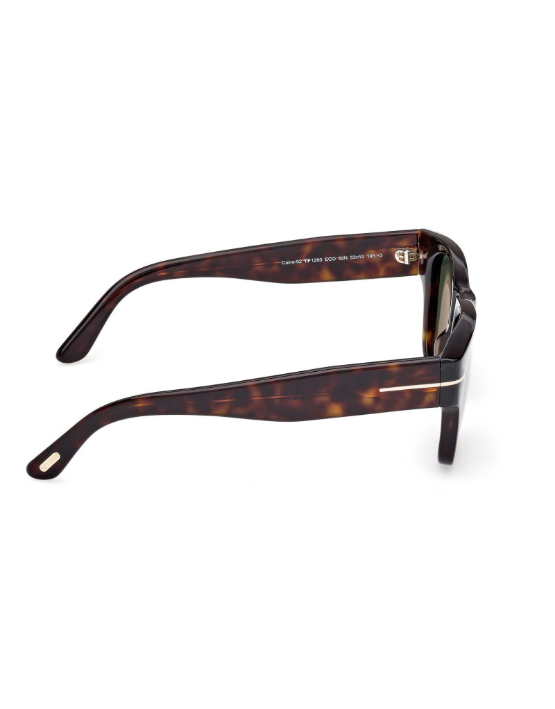 Gli occhiali da sole Tom Ford FT1280 52N presentano una montatura quadrata in acetato color tartaruga scuro, con lenti verdi e aste impreziosite dal logo "T" in metallo argentato. Questo design elegante e contemporaneo è ideale per chi cerca uno stile raffinato e distintivo.