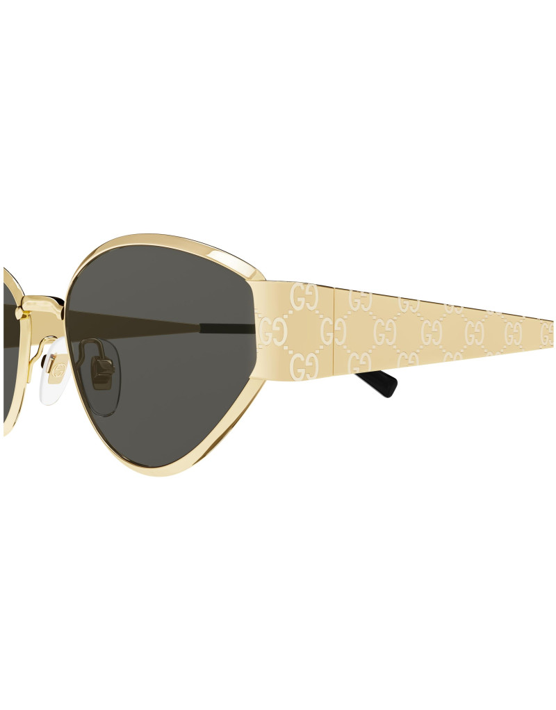 Gli occhiali da sole Gucci GG1853S 001 presentano una montatura geometrica in metallo color oro lucido, caratterizzata da un motivo laserato Guccissima sulle aste e terminali neri. Le lenti in bio-nylon grigio tinta unita offrono protezione totale dai raggi UVA/UVB. Con dimensioni di 55 mm per le lenti, 19 mm per il ponte e 145 mm per le aste, questi occhiali sono realizzati in Giappone e sono confezionati con custodia e accessori originali.