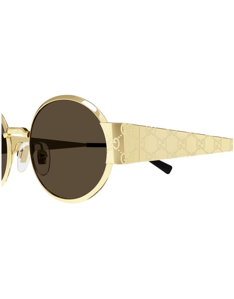 Gli occhiali da sole Gucci GG1854S 005 presentano una montatura ovale in metallo color oro lucido, caratterizzata da una texture Guccissima laserata sulle aste. Le lenti marroni in bio-nylon offrono protezione totale dai raggi UVA/UVB. Questo modello, realizzato in Giappone, è unisex e si adatta a visi di forma ovale, quadrata o a cuore. Viene fornito con custodia e accessori originali. Ideale per chi cerca uno stile distintivo e un tocco di lusso discreto.