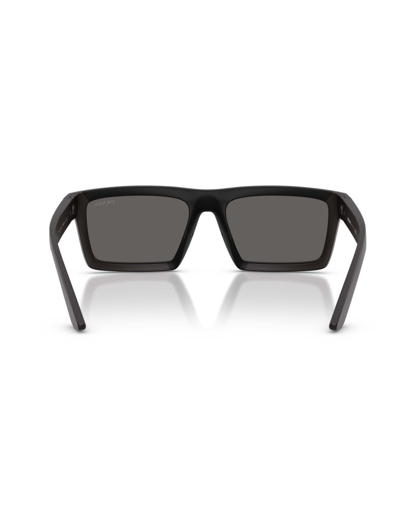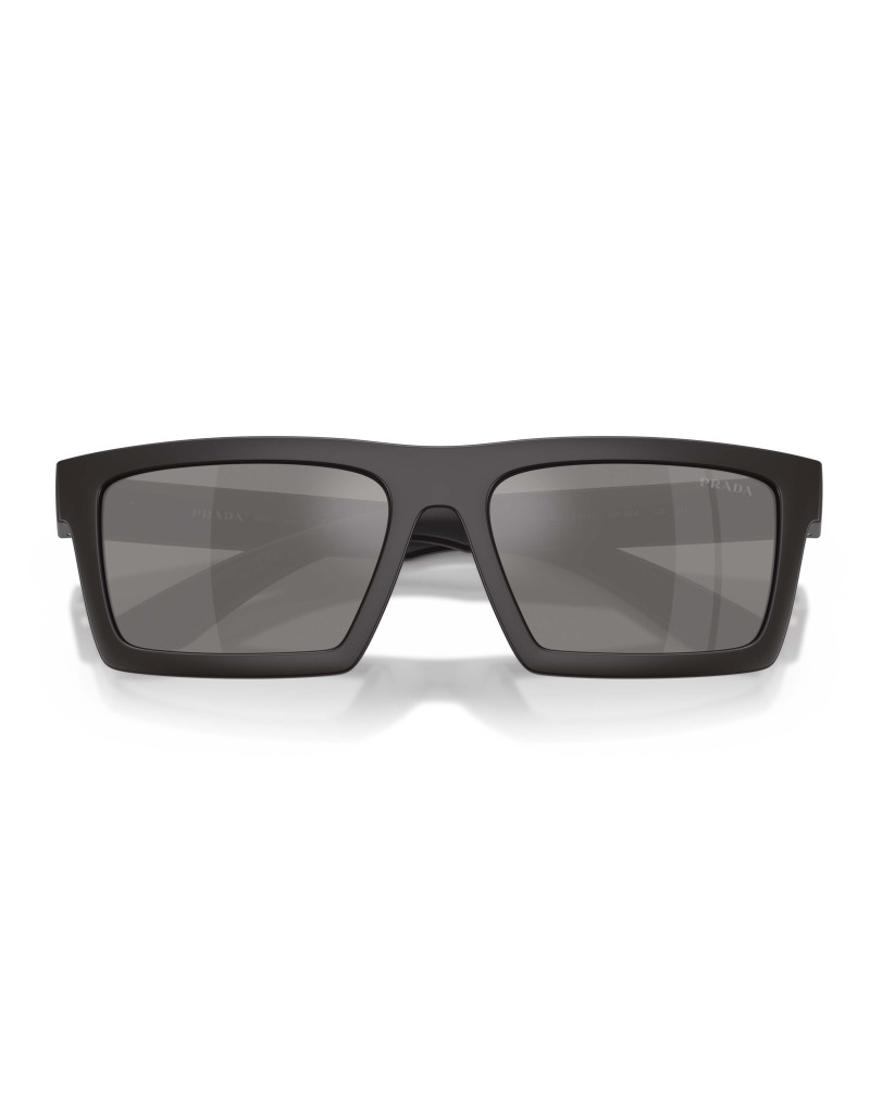 Gli occhiali da sole Prada Linea Rossa PS A07S 18K60A presentano una montatura rettangolare in nylon grigio opaco con aste in gomma nera, conferendo un aspetto sportivo e moderno. Le lenti specchiate grigio argento in policarbonato offrono protezione UV400.