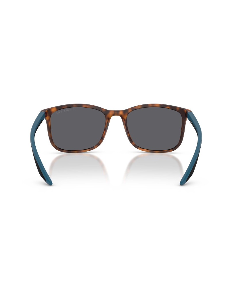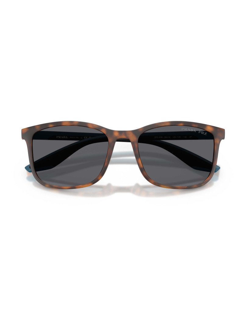 Gli occhiali da sole Prada Linea Rossa PS A08S U61144 presentano una montatura rettangolare in acetato havana, con lenti polarizzate grigio scuro in policarbonato. Le lenti offrono protezione UV400 e riducono i riflessi, migliorando la visibilità in condizioni di luce intensa. La montatura è leggera e resistente, con un design moderno e sportivo.