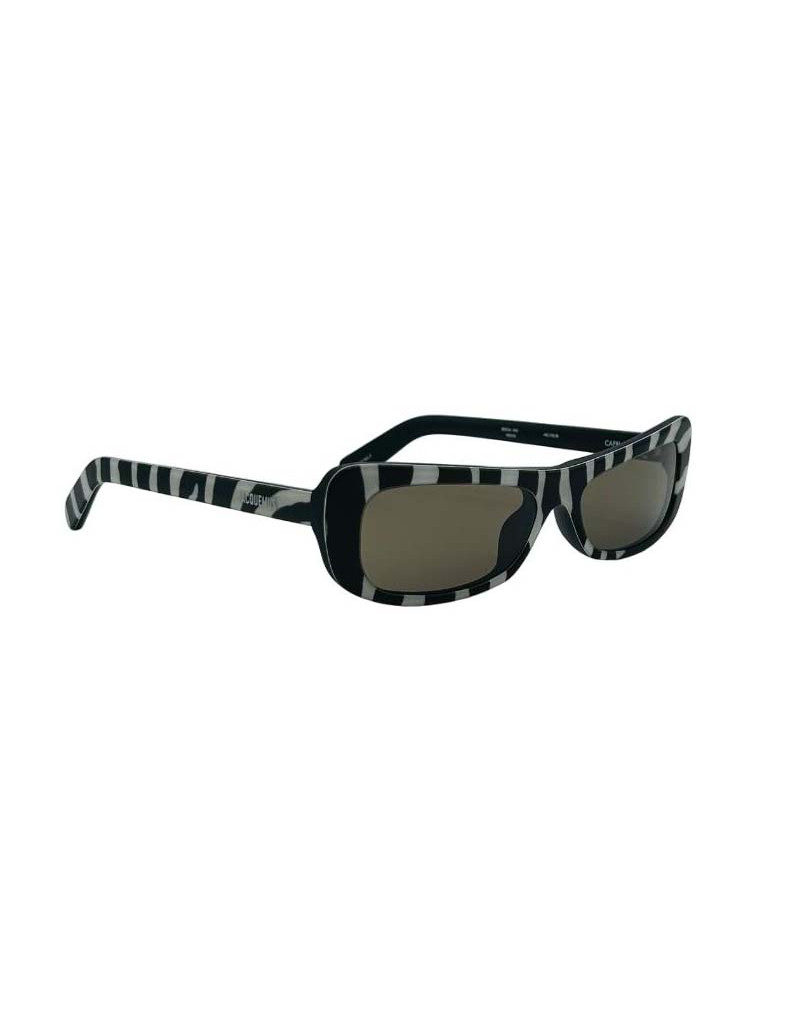Occhiali da sole Jacquemus Capri Zebra Black and White 8: un modello che fonde l'eleganza rétro con un tocco contemporaneo. La montatura in acetato effetto zebra bianco e nero presenta una silhouette rettangolare e leggermente cat-eye, impreziosita da dettagli in metallo argento opaco. Le lenti grigie offrono una protezione UV al 100%, mentre il design raffinato e audace rende questo modello un must-have per chi cerca uno stile distintivo e sofisticato.