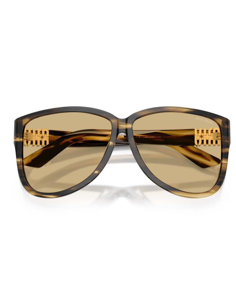 Occhiali da sole Miu Miu a08s per donna che presentano una montatura in acetato lucido color havana, con una forma irregolare e audace che dona un tocco moderno e originale al look. Le lenti marrone chiaro, abbinate alla montatura elegante, offrono una protezione UV di alta qualità, mentre il marchio distintivo sulle aste conferisce un accento di lusso e sofisticatezza. Perfetti per chi cerca un accessorio di tendenza che unisca funzionalità e stile in modo unico e innovativo.