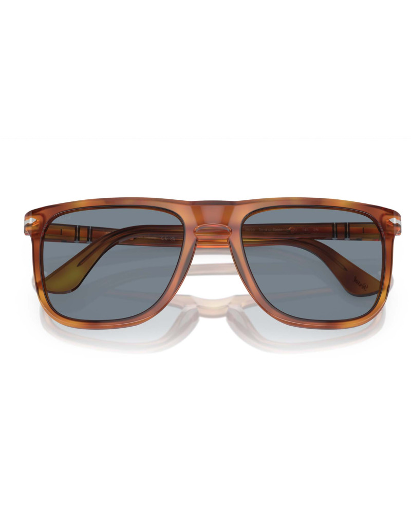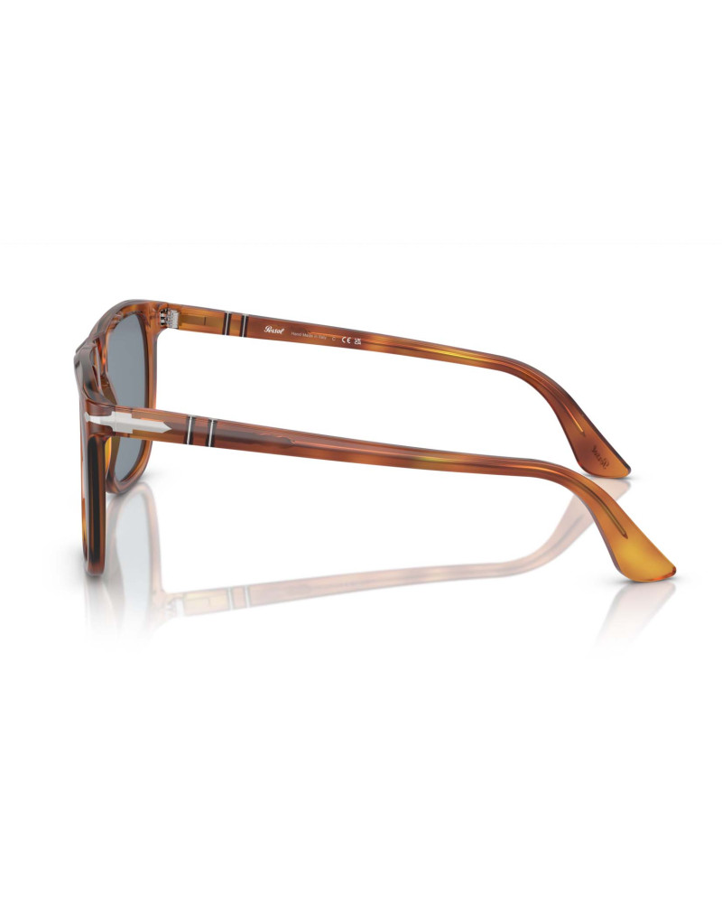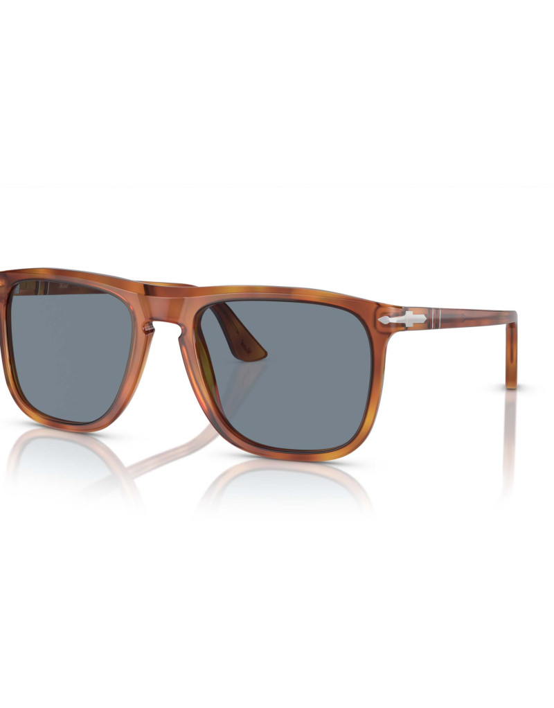Occhiali da sole Persol 3336s 96/56, un modello audace ed elegante con montatura color Terra di Siena e lenti azzurre in vetro cristallo di qualità superiore. Progettati per offrire nitidezza visiva e comfort in condizioni di luce moderata grazie al filtro UV 400 categoria 2N. Il ponte alto assicura un fit comodo a qualsiasi tipologia di viso.