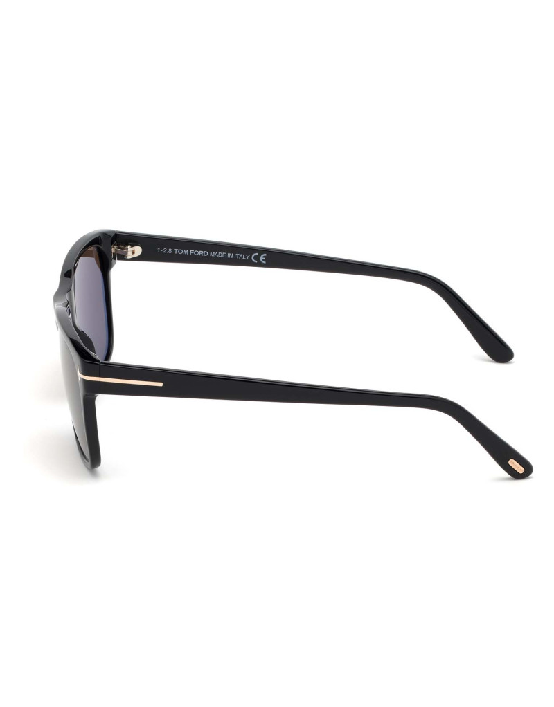 Occhiali da sole Tom Ford FT0698 01J, modello Giulio. Montatura in acetato nero lucido, lenti marroni Roviex con protezione UV400 e dettagli sofisticati, come il logo “T” metallico sulle aste. Forma geometrica squadrata, adattabile ad ogni tipologia di volto maschile.
