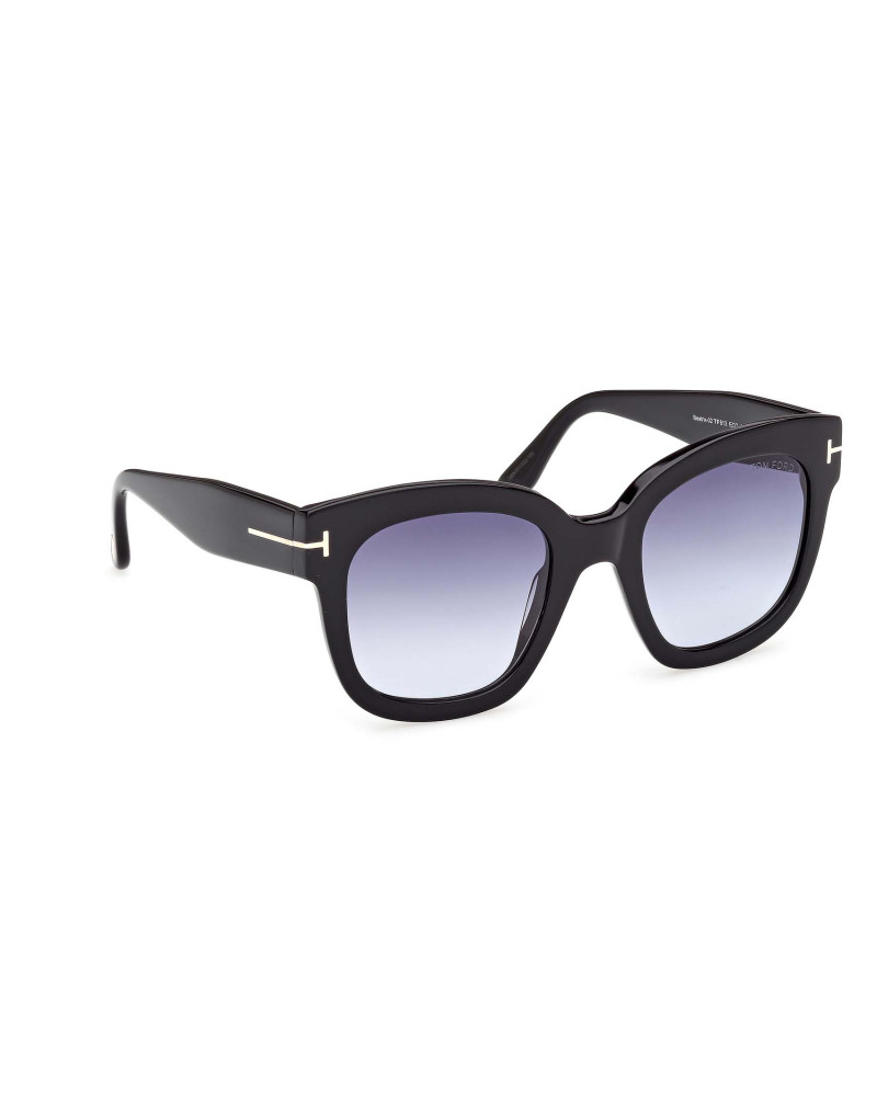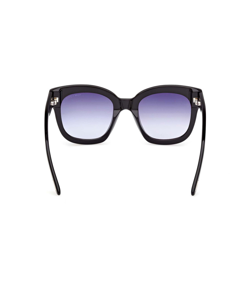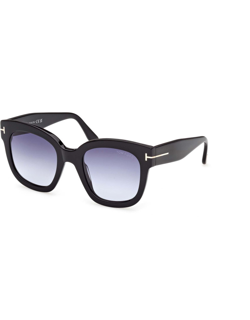 Gli occhiali da sole Tom Ford FT0613 01W, parte della collezione Beatrix-02, presentano una montatura squadrata overzise in acetato nero lucido, con lenti blu sfumato che offrono una protezione UV al 100%. Il design è arricchito dal dettaglio iconico "T" in metallo sulle aste, conferendo un tocco di eleganza discreta.