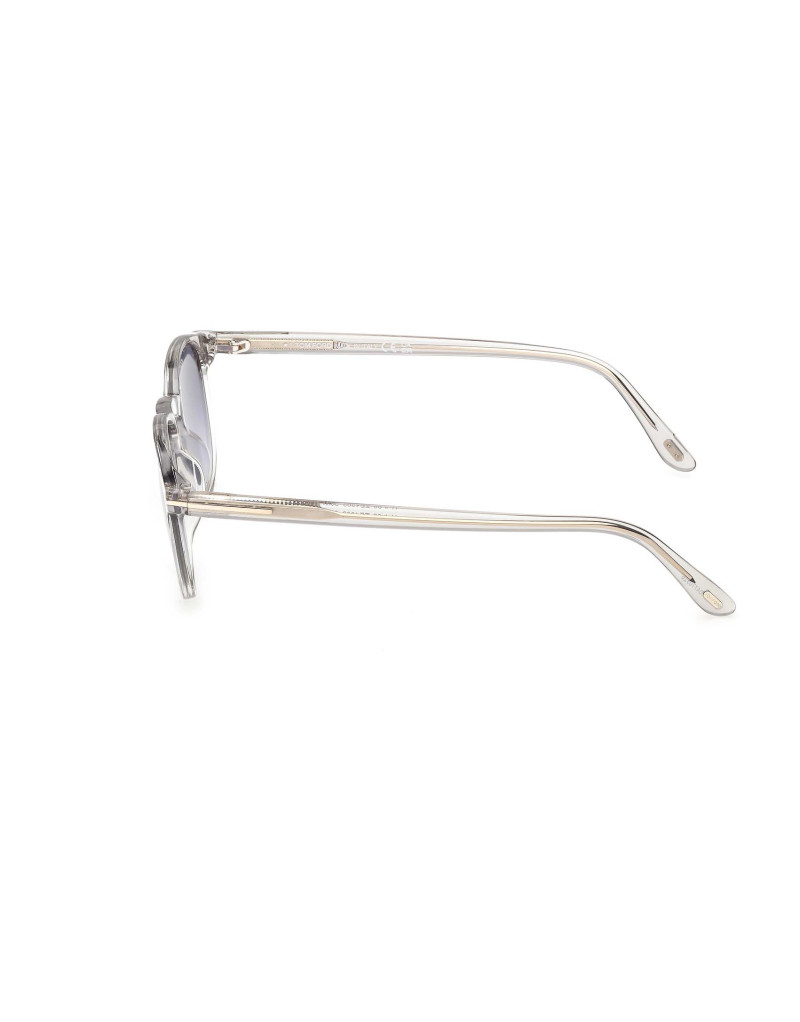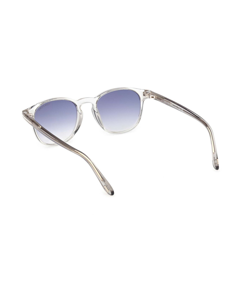 Occhiali da sole Tom Ford FT1302 20W che presentano un design iconico con una montatura in acetato trasparente lucido e lenti blu sfumato. Questo modello è ideale per chi cerca un accessorio versatile, perfetto per ogni occasione.