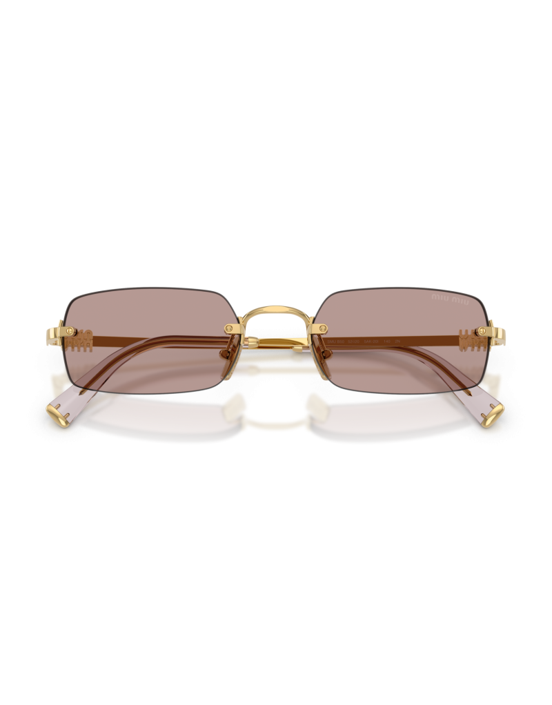 Occhiale da sole Miu MiuB50S 5AK20I dalla forma rettangolare elegante e adatto a tutte le occasioni. Il frontale senza montatura mette in primo piano lo sguardo con raffinatezza, le aste oro con dettaglio logo stilizzato conferiscono comfort e sofisticatezza al tempo stesso.