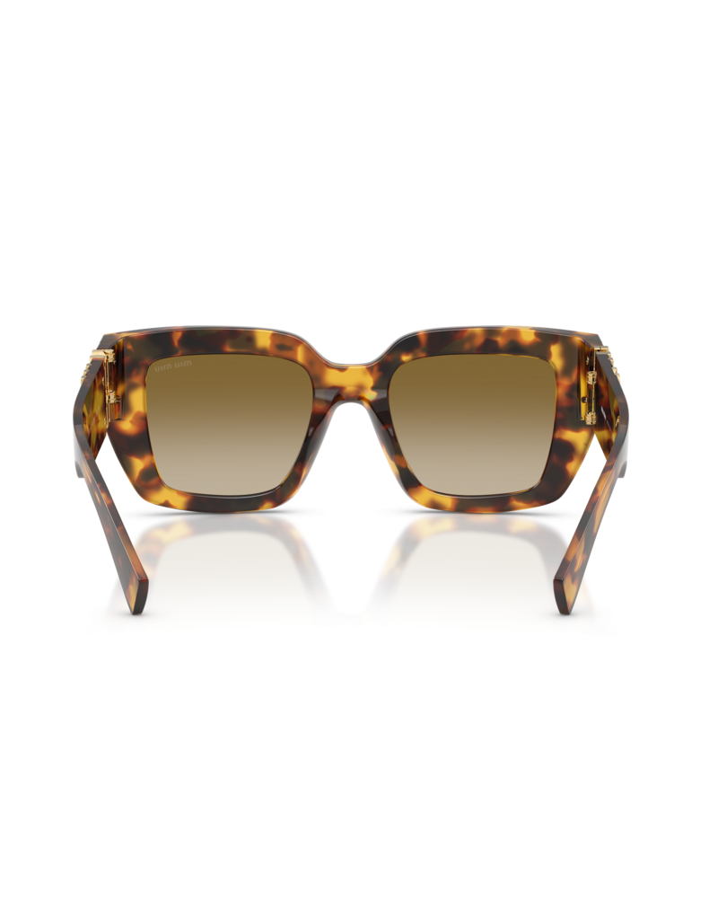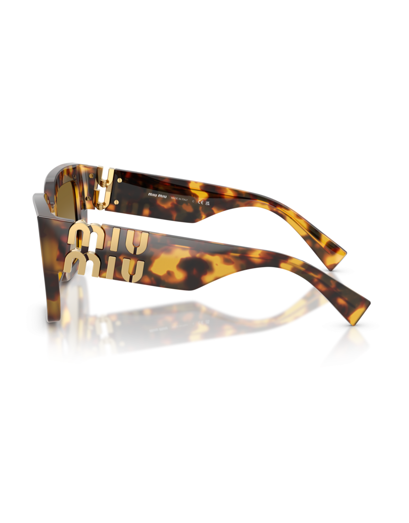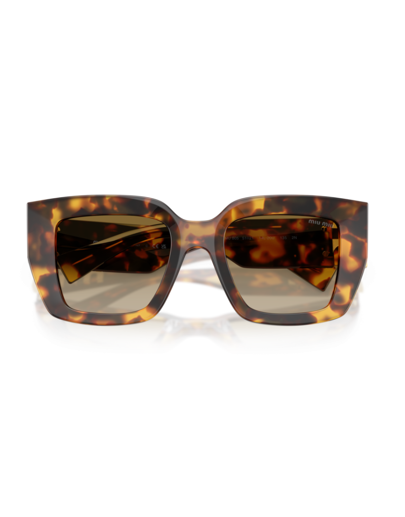 Occhiali da sole Miu Miu b05s per donna che presentano una montatura in acetato lucido color havana, con una forma squadrata e audace che dona un tocco moderno e originale al look. Le lenti marrone sfumato, abbinate alla montatura elegante, offrono una protezione UV di alta qualità, mentre il marchio distintivo sulle aste conferisce un accento di lusso e sofisticatezza. Perfetti per chi cerca un accessorio di tendenza che unisca funzionalità e stile in modo unico e innovativo.