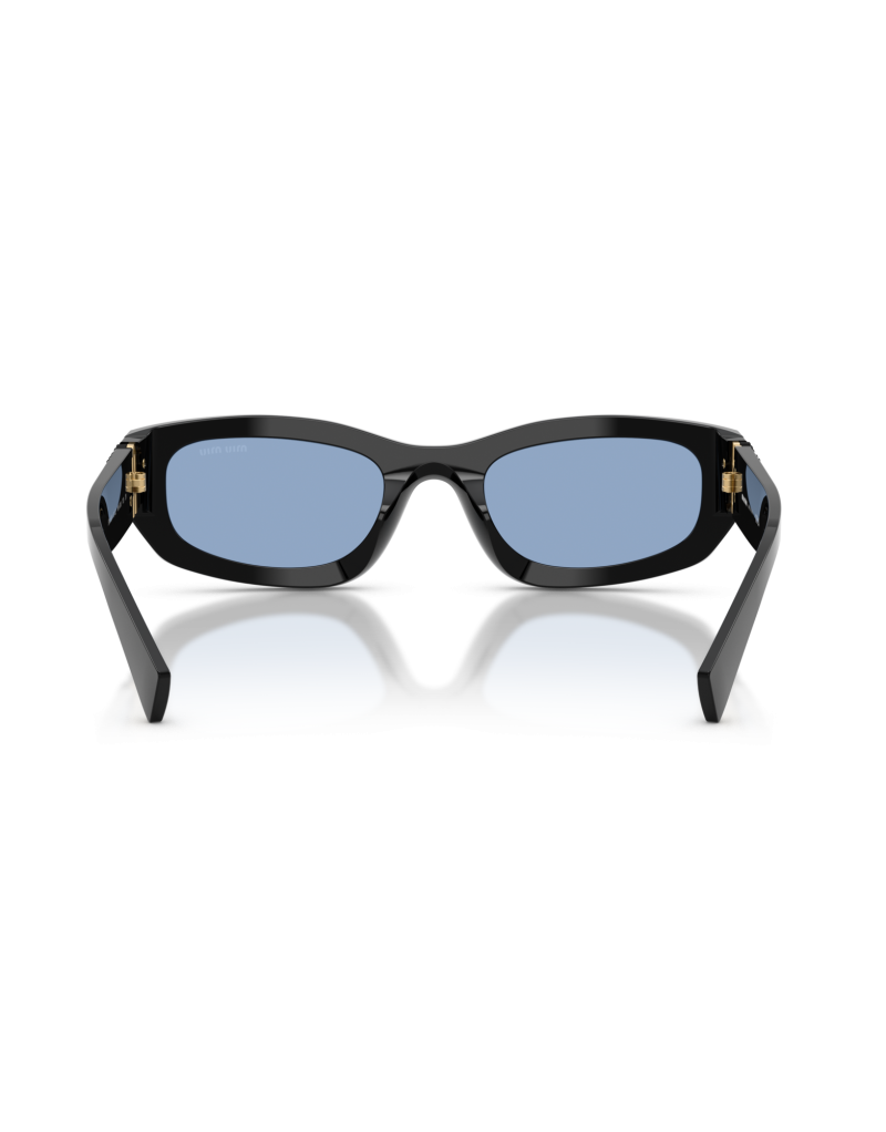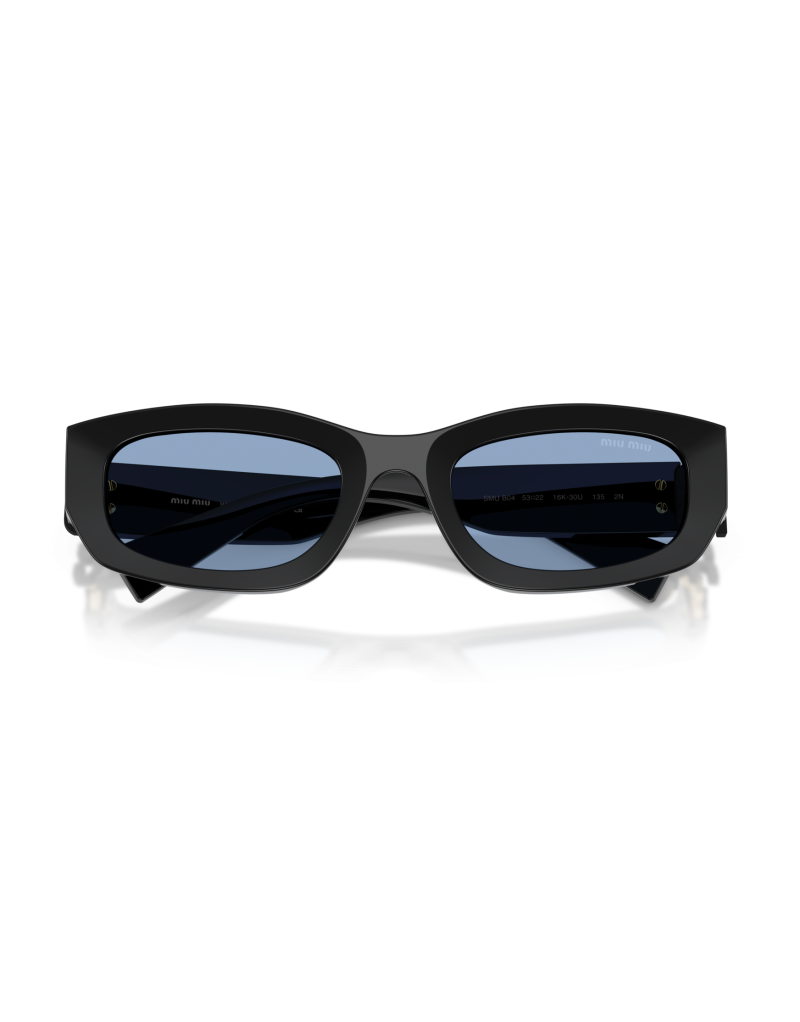 Occhiali da sole Miu Miu B04S 14L09Z da donna con montatura in acetato nero lucido. Un modello dalla forma rettangolare con lenti blu in contrasto che rendono il look unico e glamour.