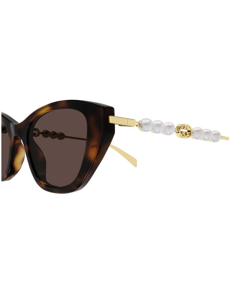 Gli occhiali da sole Gucci GG1968S 003 nella raffinata tonalità Havana/Gold Brown combinano una montatura in acetato havana lucido con dettagli in metallo oro e lenti marrone pieno, per un look femminile e sofisticato. La silhouette “cat‑eye” e le aste arricchite da 6 perle o cristalli su ciascun lato conferiscono eleganza e carattere al volto, rendendo questo modello perfetto per chi cerca un accessorio di lusso distintivo e senza tempo.
