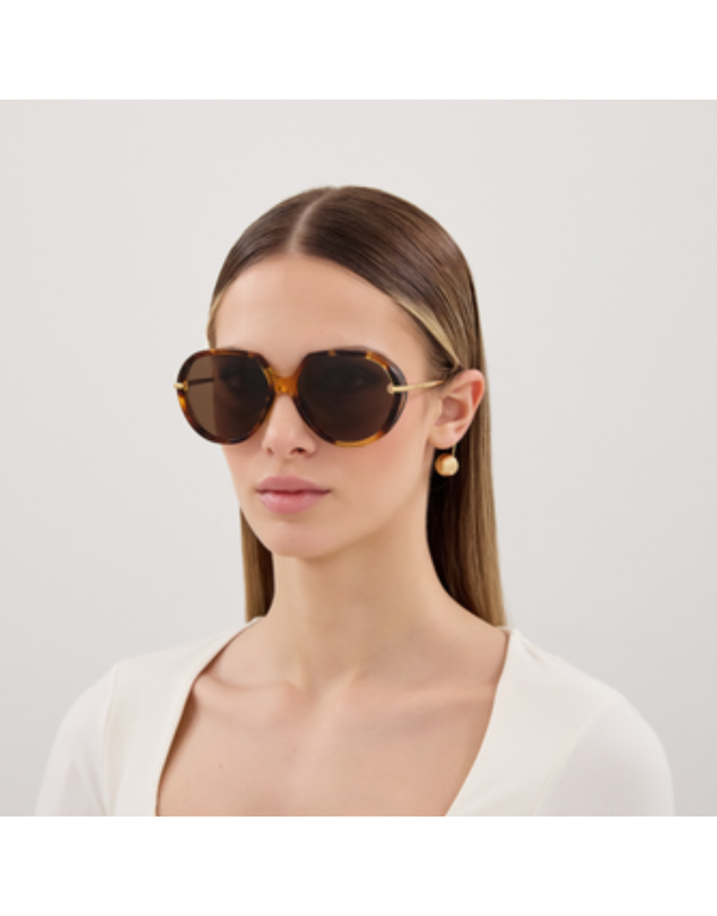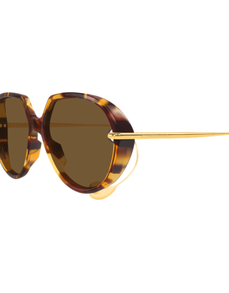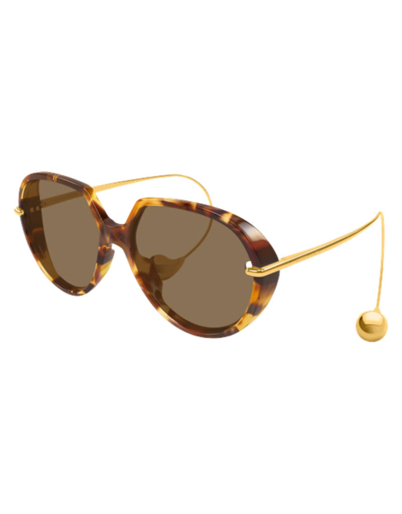 Gli occhiali da sole Bottega Veneta BV1436S 002 reinterpretano l’eleganza contemporanea con un’estetica audace e distintiva, perfetta per chi ama uno stile sofisticato e pieno di carattere. Il design oversized con silhouette rotonda-geometrica fonde un’allure vintage con dettagli moderni, creando un accessorio di grande personalità e presenza. La montatura in acetato havana è valorizzata da elementi in metallo con finitura oro, che conferiscono un contrasto sofisticato. A rendere unico il modello è il dettaglio iconico sulla asta/terminali a goccia — un tocco di design che richiama la riconoscibilità e l’artigianalità della maison. Le lenti marroni offrono una visione confortevole e calda, perfetta per condizioni di luce intensa o per chi desidera un look deciso e contemporaneo.