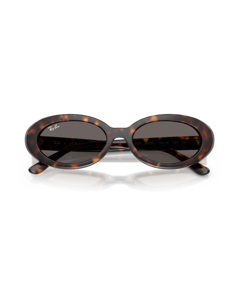 Occhiali da sole Ray-Ban 2223 902/b1 54 una montatura in acetato color havana, calda e sofisticata, abbinata a lenti grigio scuro in cristallo che garantiscono una visione nitida e naturale. La forma ovale, morbida ed equilibrata, dona un look raffinato con un tocco rétro, perfetto per chi cerca eleganza discreta e versatilità quotidiana