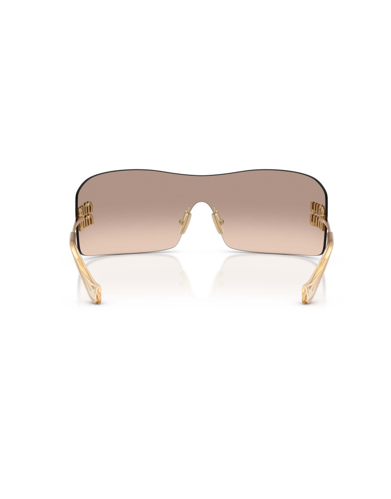 Occhiali da sole Miu Miu B53S 5AK20P, una montatura rimless con aste in metallo color oro e dettagli raffinati, abbinata a lenti marrone sfumato, perfette per una visione confortevole e un look sofisticato. La forma fasciante, elegante e femminile, dona un tocco di glamour senza tempo. Ideali per chi cerca un accessorio distintivo e di forte personalità, capace di valorizzare ogni outfit con un’eleganza audace.