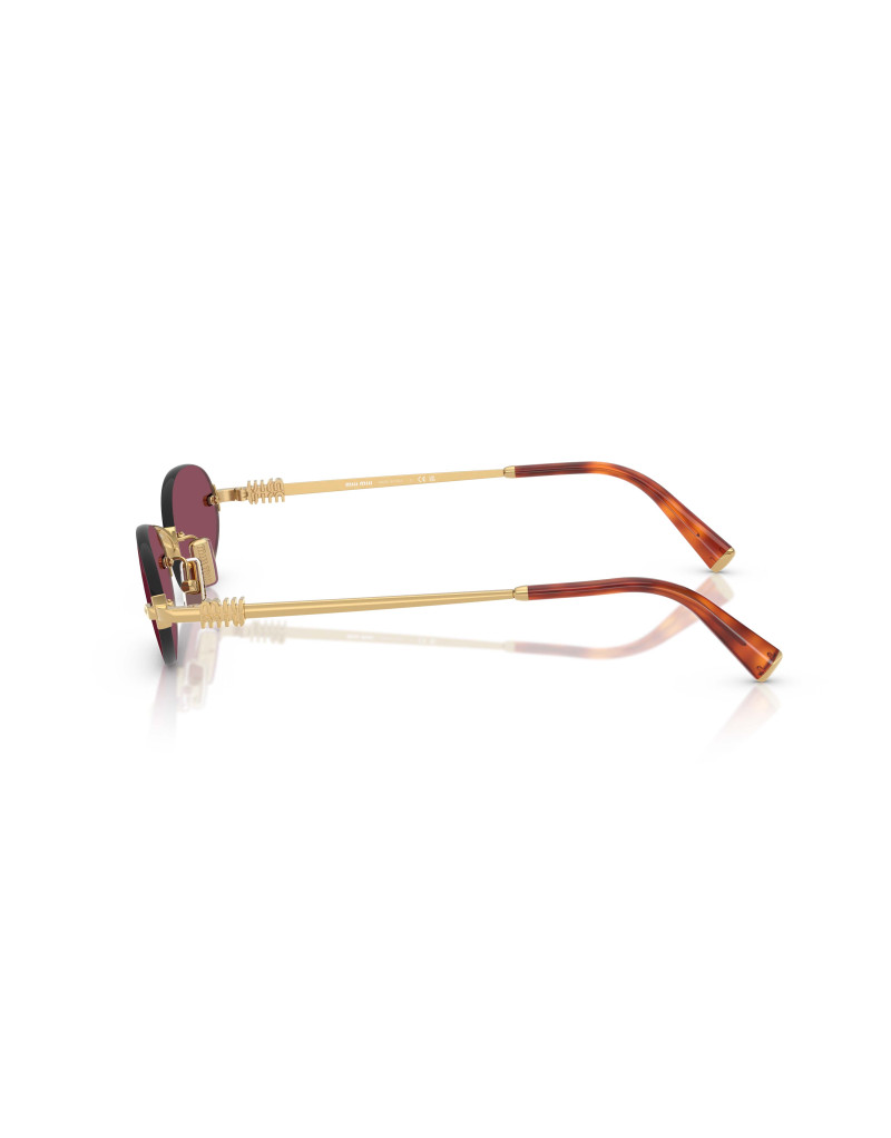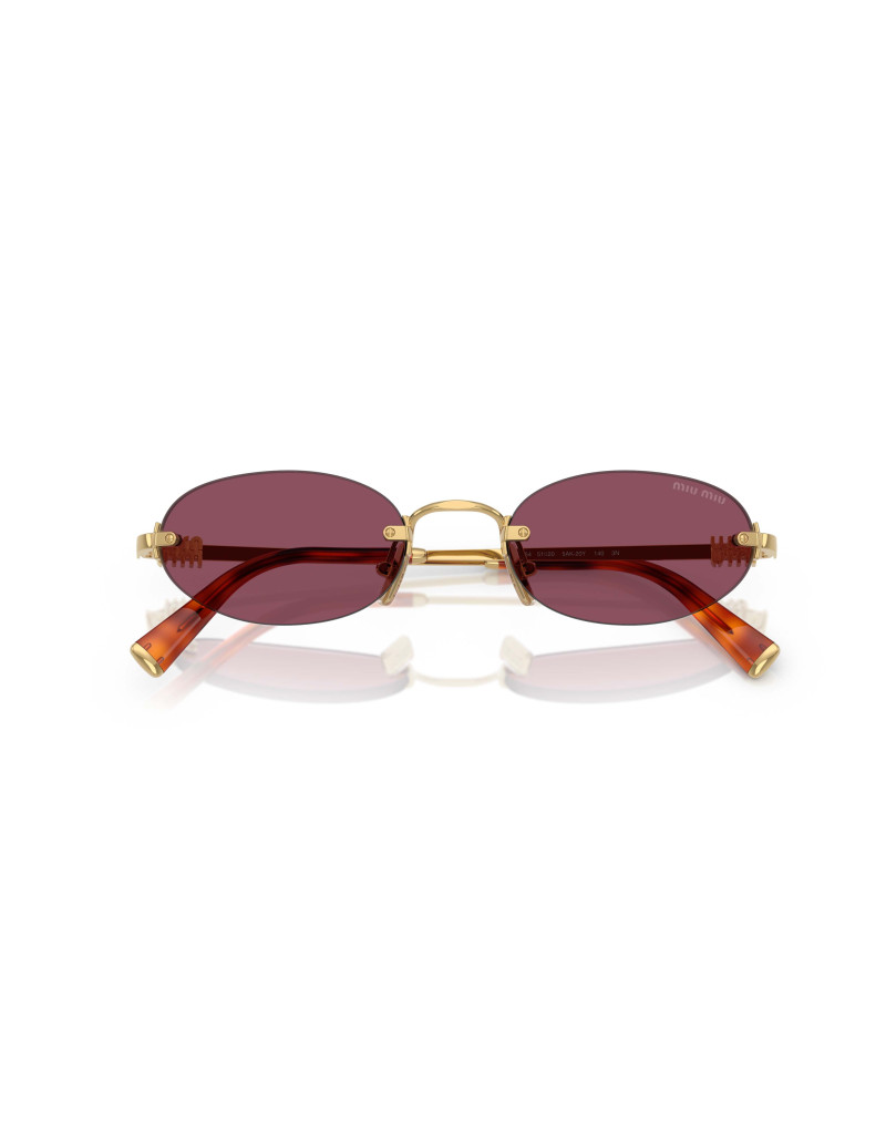 Occhiali da sole Miu Miu A54S 5AK20Y, una montatura in metallo color oro, sottile e luminosa, abbinata a lenti viola scuro, ideali per garantire protezione e uno stile distintivo. La forma ovale, elegante e contemporanea, dona leggerezza al volto con un tocco sofisticato. Un modello femminile e di forte personalità, perfetto per chi ama accessori iconici e ricercati.